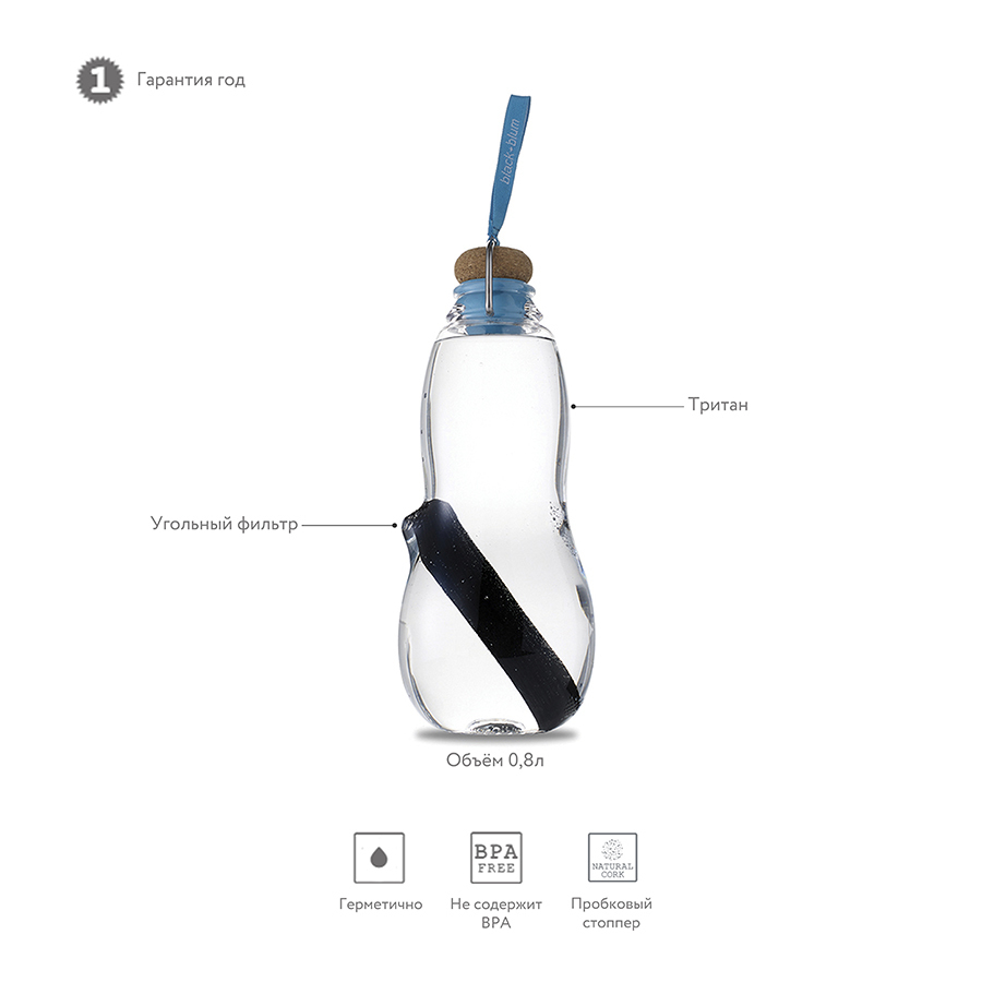 Эко-бутылка объемом 800 мл. из тритана с крышкой из натуральной пробки и угольным фильтром в комплекте. Материалом для бутылки служит экологически безопасный тритан, искусно имитирующий стекло, но гораздо более прочный и устойчивый к царапинам. Крышка из натуральной пробки снизу покрыта мягким силиконом и фиксируется к корпусу при помощи стального зажима, украшенного цветной матерчатой лентой для переноски. В корпусе имеется специальное углубление для фирменного угольного фильтра Binchotan, который входит в комплект. Положите уголь в бутылку с обычной водой и оставьте на 6-8 часов. Он вытянет из воды все вредные вещества, наполнит ее полезными минералами и выровняет уровень Ph. Используйте уголь таким образом 3 месяца, затем прокипятите 10 минут и используйте еще 3 месяца. По истечении этого времени утилизируйте в качестве подкормки для домашних растений. Ваша персональная эко-бутылка Eau Good – отличная замена для одноразовых пластиковых бутылок. Возьмите ее с собой на прогулку, учебу, в офис, спортзал или путешествие – Eau Good будет идеальным спутником в любой ситуации. Не содержит вредные Бисфенол-А(BPA) и фталаты.
