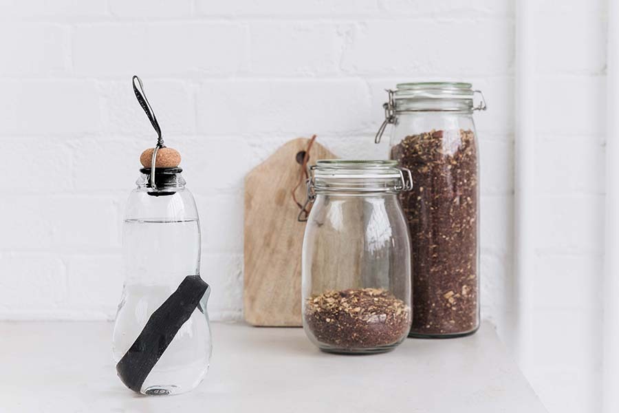 Материалом для бутылки служит экологически безопасный тритан, искусно имитирующий стекло, но гораздо более прочный и устойчивый к царапинам. Крышка из натуральной пробки снизу покрыта мягким силиконом и фиксируется к корпусу при помощи стального зажима, украшенного цветной матерчатой лентой для переноски. В корпусе имеется специальное углубление для фирменного угольного фильтра Binchotan, который входит в комплект.