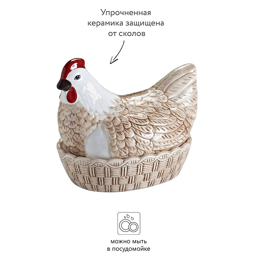 Оригинальная подставка для яиц Rise and Shine гармонично впишется в интерьер любой кухни. Дизайнеры создали аксессуар, воодушевляясь красотой британских фермерских дворов. Ёмкость в виде курицы на гнезде предназначена для хранения свежих яиц. Помимо этого подставка подходит для подачи фруктов, овощей и других продуктов. Изделие выполнено из легкого, качественного доломита с глянцевой поверхностью, которая отличается прочностью и стойкостью к сколам. Подставку можно мыть в посудомоечной машине.