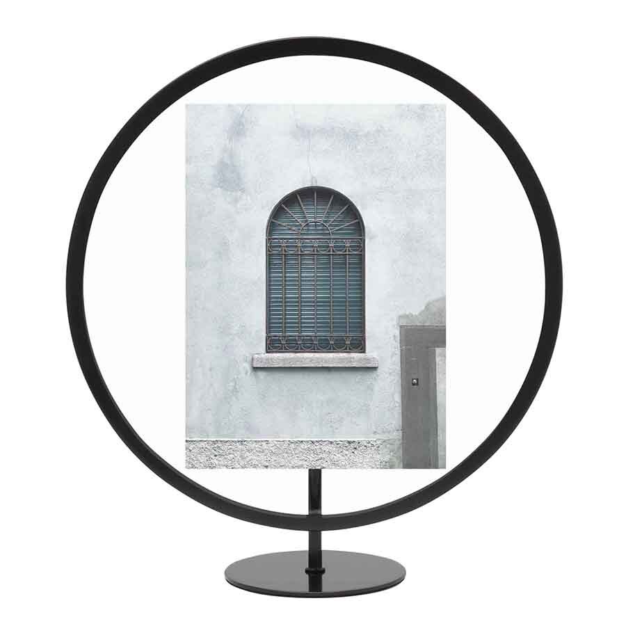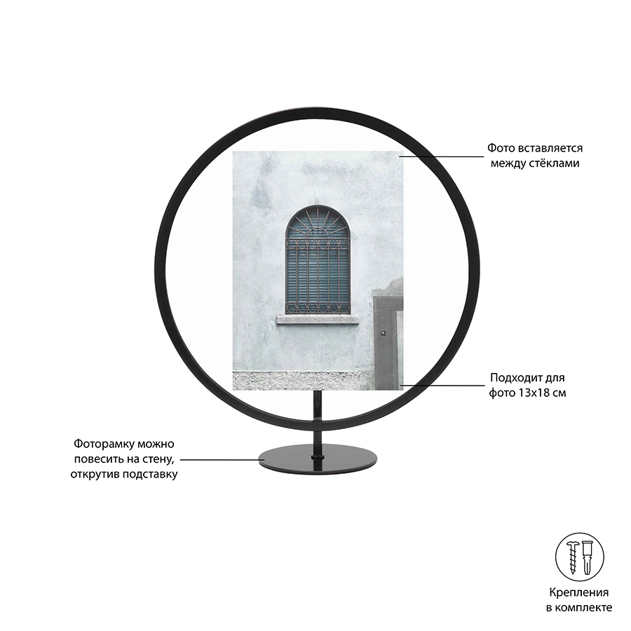 Конструкция изделия позволяет размещать фотографию между двух стеклянных панелей, тем самым защищая ее загрязнения и выгорания. Корпус круглой формы выполнен из качественного металла, стойкого к коррозии и ультрафиолетовым лучам. Фоторамку можно прикрепить к стене или поставить на стол, полку или комод.