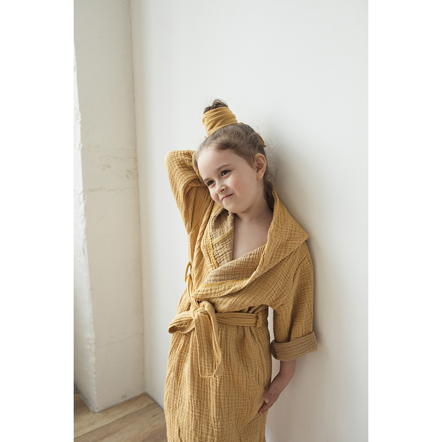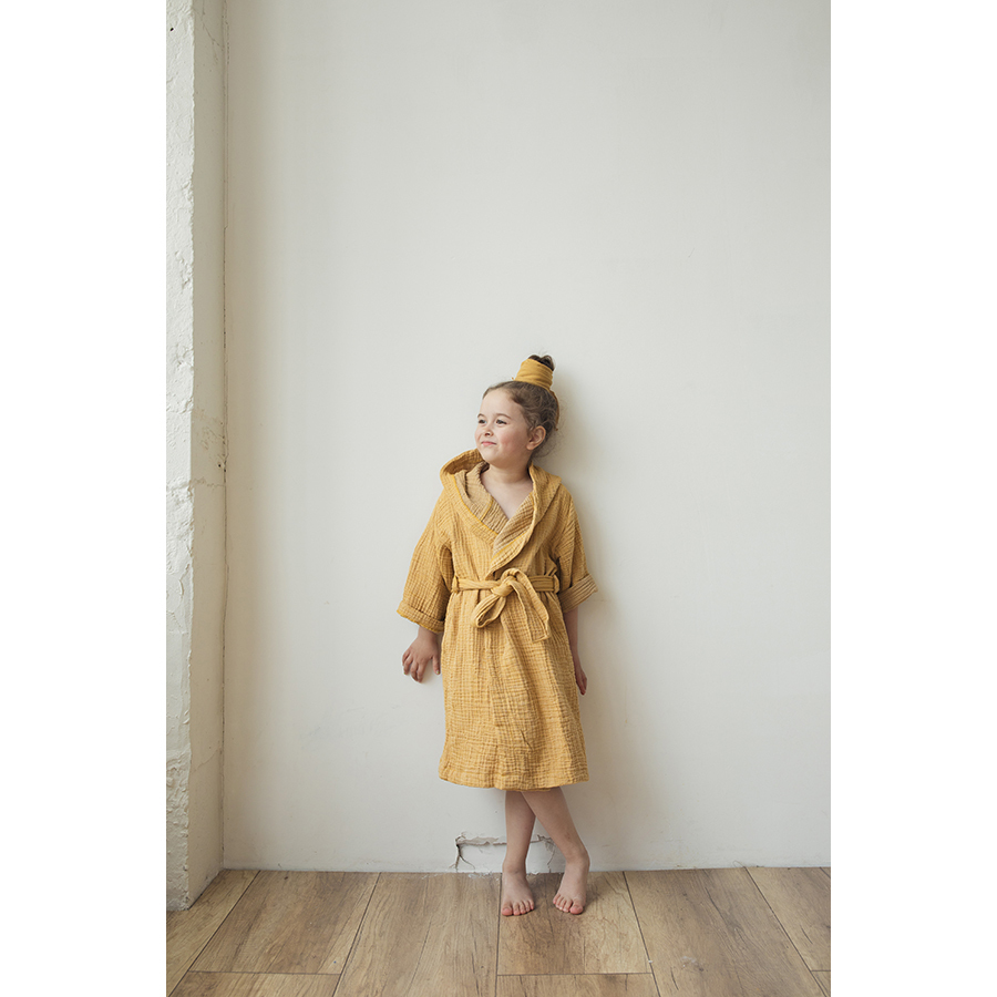 Халат из жатого хлопка горчичного цвета из коллекции Essential лаконичного дизайна и нейтральной расцветки подойдет и мальчику, и девочке. Изделие с капюшоном и с удобным запахом фиксируется на талии широким поясом.