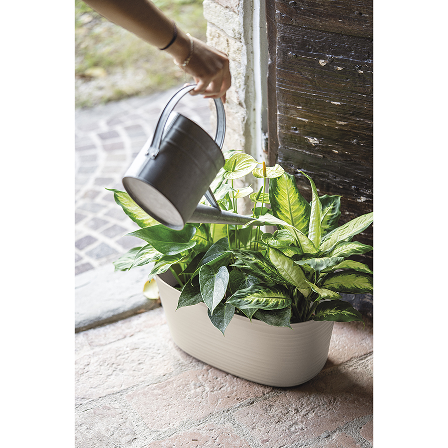 Кашпо для комнатных растений выполнено из переработанного пластика. Дизайн изделия напоминает керамику, а реалистичности внешнему виду придают тщательно подобранные пастельные тона и неровные круговые узоры, создающие эффект ручной работы.
