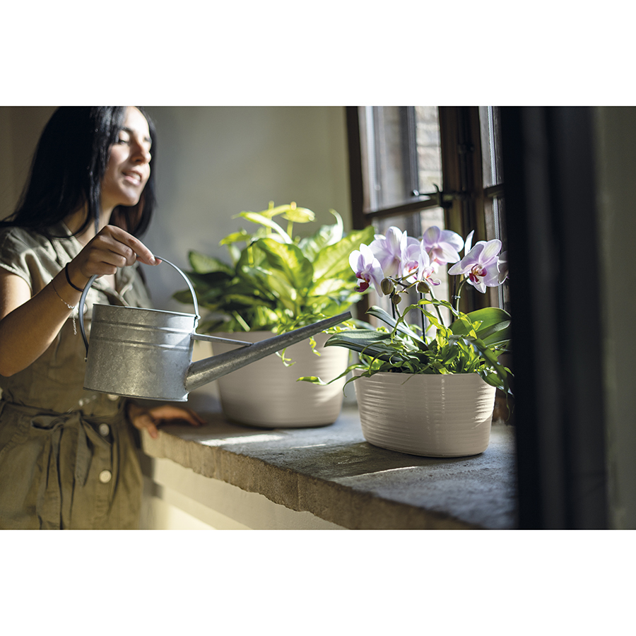 Кашпо для комнатных растений выполнено из переработанного пластика. Дизайн изделия напоминает керамику, а реалистичности внешнему виду придают тщательно подобранные пастельные тона и неровные круговые узоры, создающие эффект ручной работы.