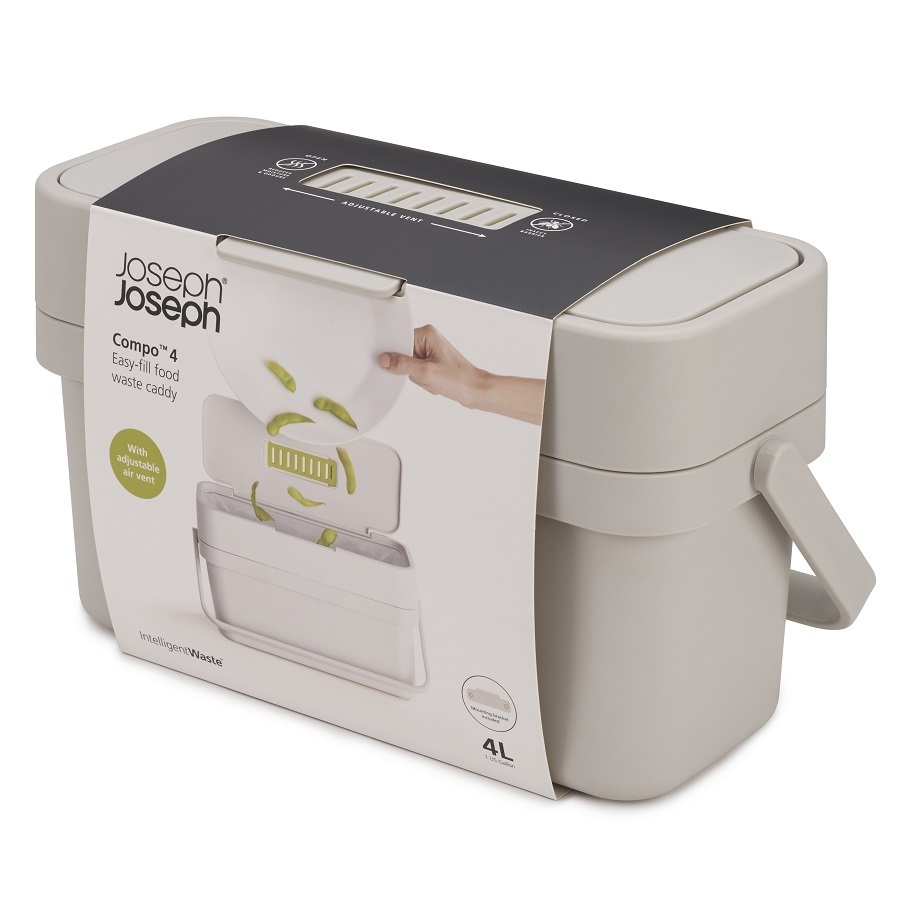 Контейнер Compo 4 разработан с целью устранения неприятных запахов от пищевых отходов. Инновационная вентилируемая конструкция позволяет воздуху циркулировать внутри емкости, что способствует уменьшению влажности. Освежающий фильтр впитывает неприятные запахи. Крышка плотно закрывается, не выпуская запахи наружу. Особенности и преимущества: - регулируемый вентиляционный клапан в крышке, уменьшающий запах - изящный дизайн, идеально подходящий для хранения на рабочей поверхности - кронштейн для крепления на дверце шкафа в комплекте - вместимость 4 литра - совместим с вкладышами Joseph Joseph IW2 Контейнер рекомендуется мыть только вручную.
