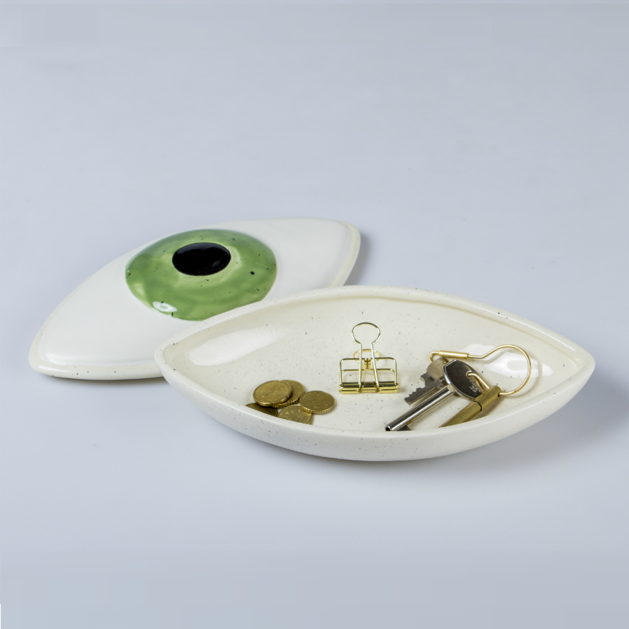 Коробка для хранения Eye предназначена для различных мелочей, которые всегда должны быть под рукой: монеты, ключи и т.д. Изделие выполнено из керамики, состоит их двух предметов: овального лотка в форме глаза человека и круглого поменьше – в форме зрачка. Модель станет прекрасным дополнением рабочего стола в офисе или дома, полочки в прихожей. Теперь необходимые мелочи всегда будут на месте. Материал: керамика. Размеры: 24х13,5х7 см