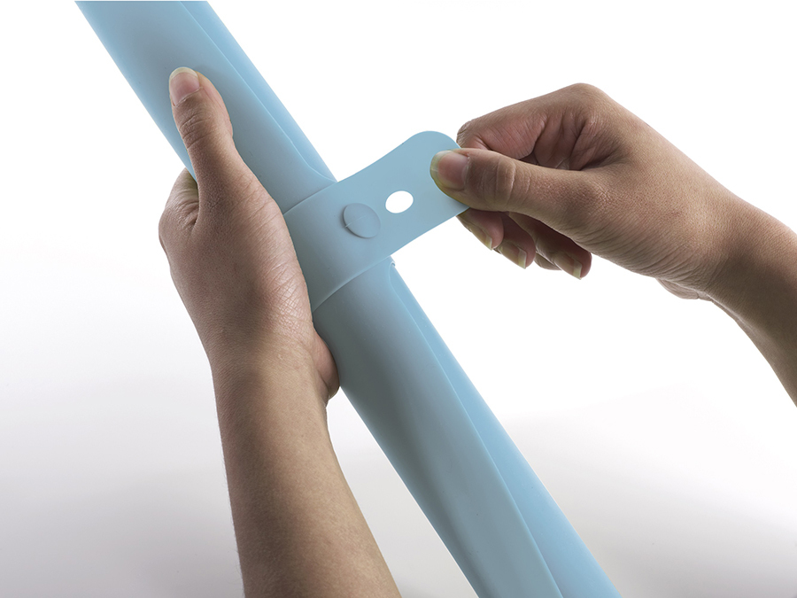 Удобные мерные деления помогут определить диаметр блюда. Благодаря силикону коврик не скользит при раскатывании. После применения легко сворачивается и застегивается на кнопку для компактного хранения.