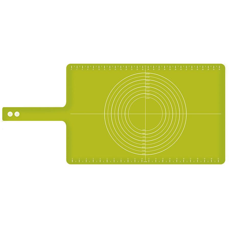 Удобные мерные деления помогут определить диаметр блюда. Благодаря силикону коврик не скользит при раскатывании. После применения легко сворачивается и застегивается на кнопку для компактного хранения.