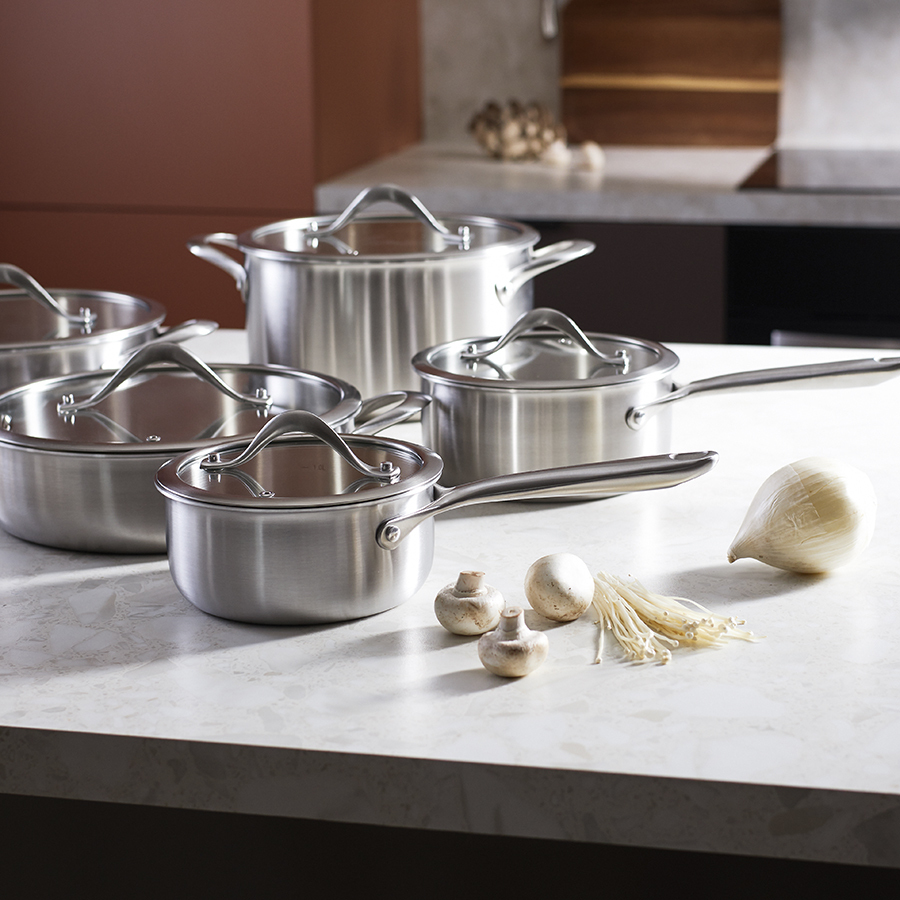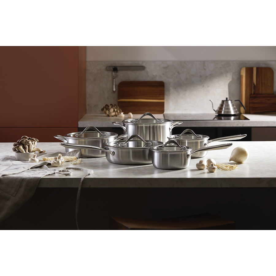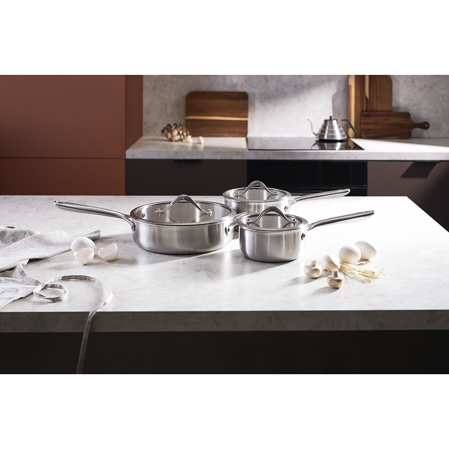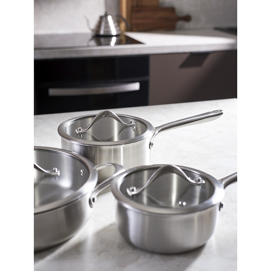 Посуда из нержавеющей стали 3Ply Etalon изготовлена по инновационной технологии TRI-PLY – ее стенки и дно имеют два слоя стали, между которыми предусмотрен слой алюминия. Эта особенность обеспечивает изделиям превосходную теплопроводность, практичность и долговечность. Коллекция идеально подходит для любых типов плит и впечатляет трендовым дизайном – сочетание современных форм и матовой поверхности делает ее настоящим украшением любой кухни.