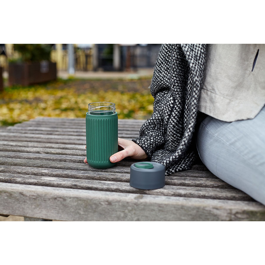 Кружку легко открывать и закрывать одной рукой. Силиконовый чехол защищает емкость из выдувного стекла от повреждений и не скользит. Боросиликатное стекло хорошо удерживает температуру и отличается прочностью. Кружка помещается в велосипедные и автомобильные подстаканники. Она пригодна для газированных напитков. Материал не содержит бисфенола-А и фталатов. Объем: 340 мл.