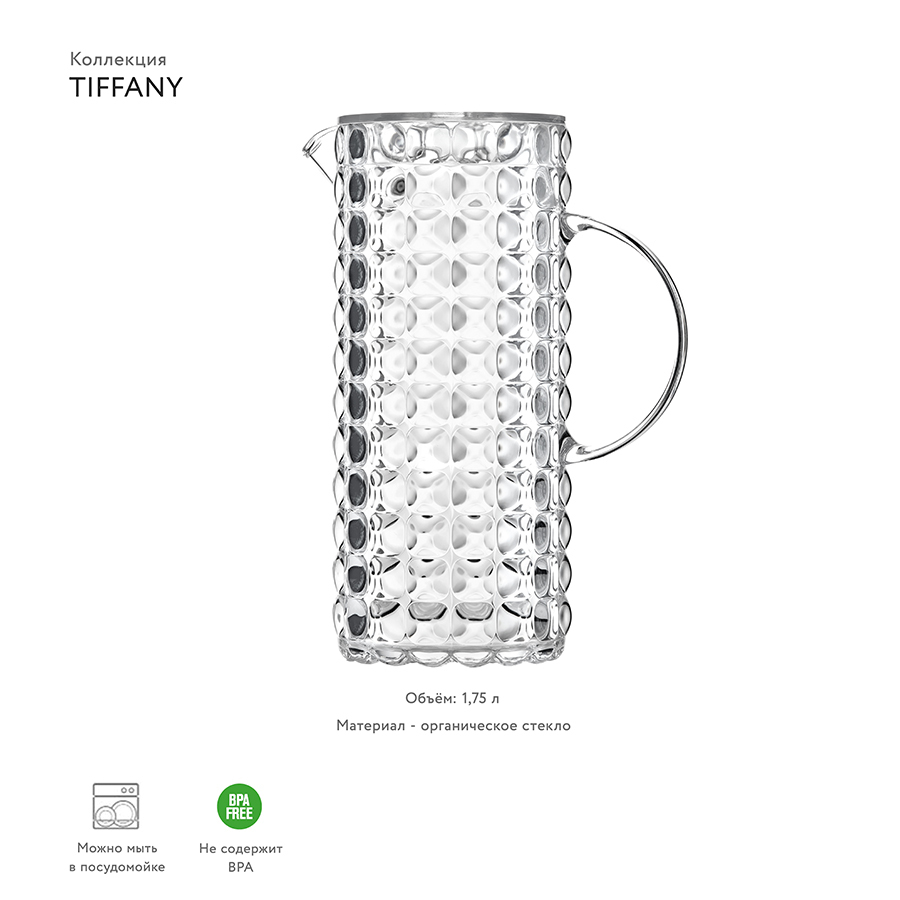 Кувшин Tiffany станет украшением любого стола. Рельефная форма в сочетании с прозрачным материалом заставляют поверхность посуды сверкать и переливаться на свету, делая ее центром притяжения взглядов. Кувшин идеально подходит для сервировки как в помещении, так и на свежем воздухе. Наличие крышки исключает попадание внутрь емкости пыли и насекомых.