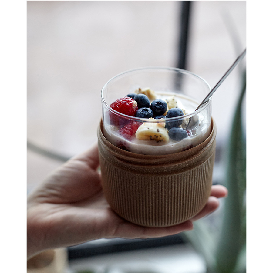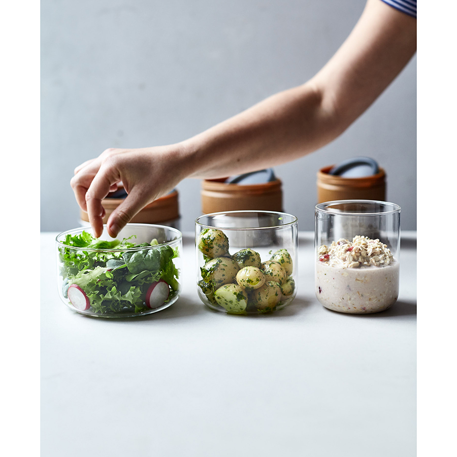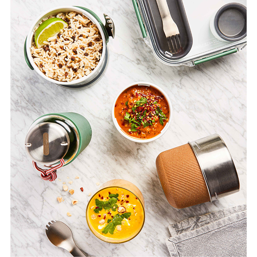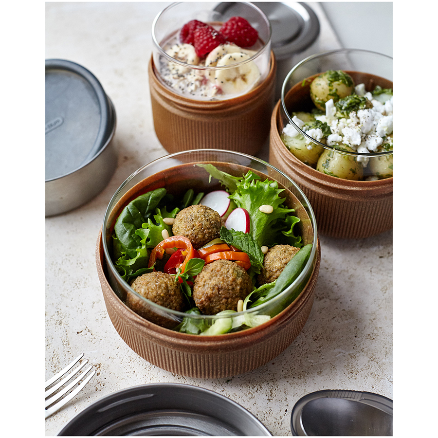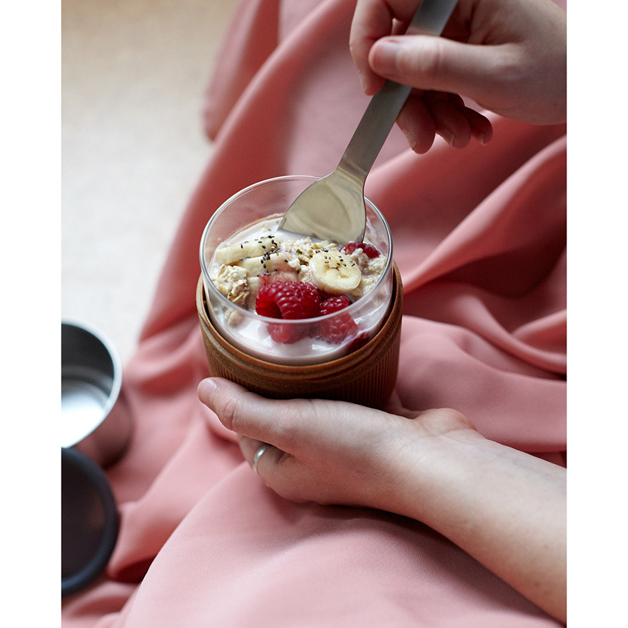 Ланч-бокс Glass Lunch Pot – удобный и вместительный контейнер для завтраков и перекусов. Его можно взять с собой на работу, на учебу или в поездку. Контейнер объемом 450 мл не занимает много места в сумке и позволяет вместить мюсли, йогурт, фруктовый или овощной салат. Внешний чехол изготовлен из прочного полипропилена с добавлением целлюлозы. Он защищает стеклянный контейнер, а также не дает обжечь руки после разогревания блюда. Верхняя крышка из нержавеющей стали легко закручивается, силиконовая крышка плотно прилегает к горлышку и обеспечивает герметичность при транспортировке. Контейнер можно хранить в морозильной камере и мыть в посудомоечной машине. При разогреве пищи в микроволновой печи верхнюю крышку следует снять, а силиконовую – слегка открыть для выхода пара.
