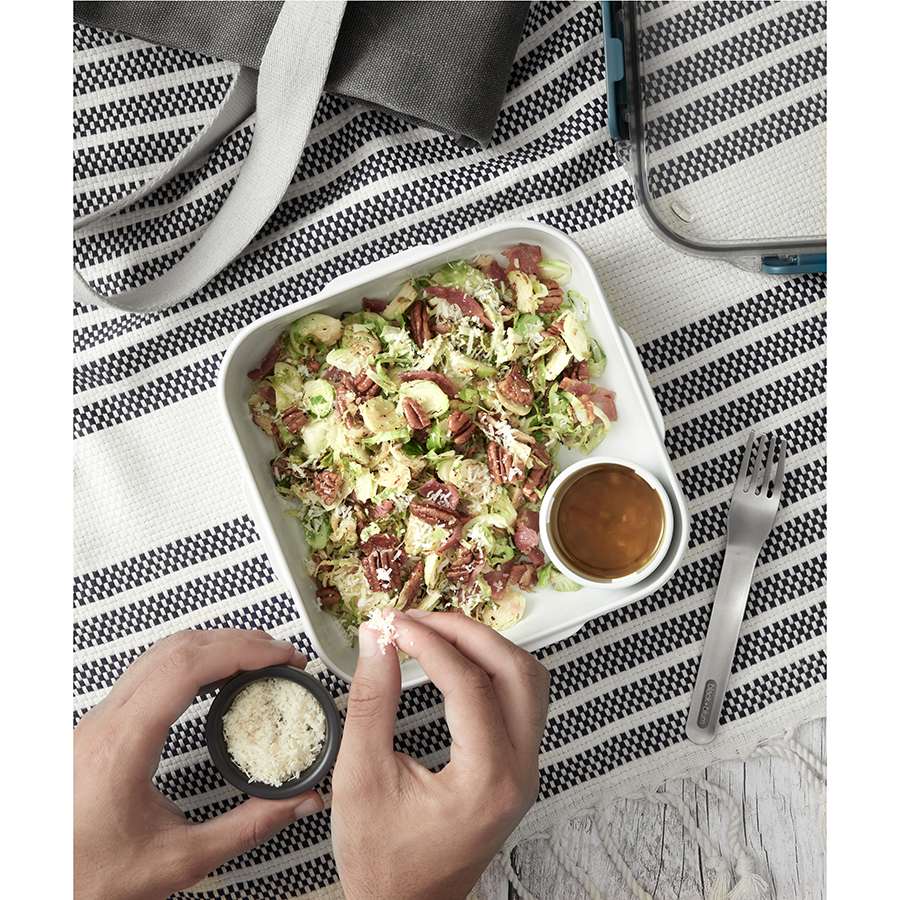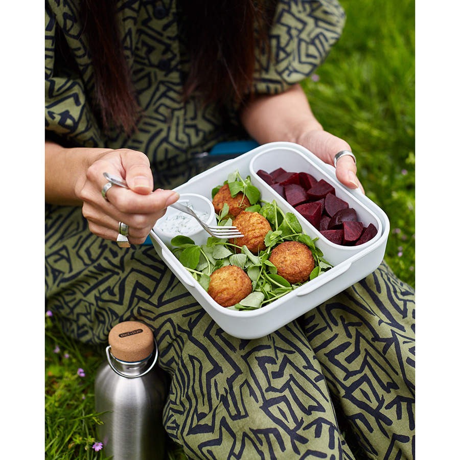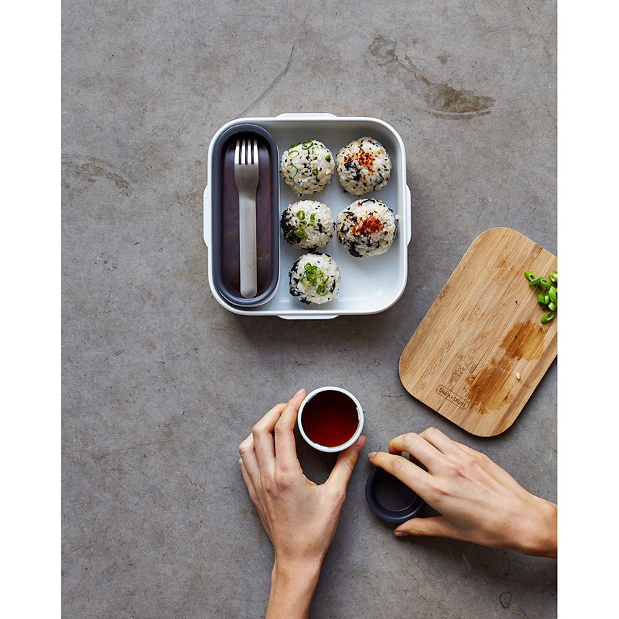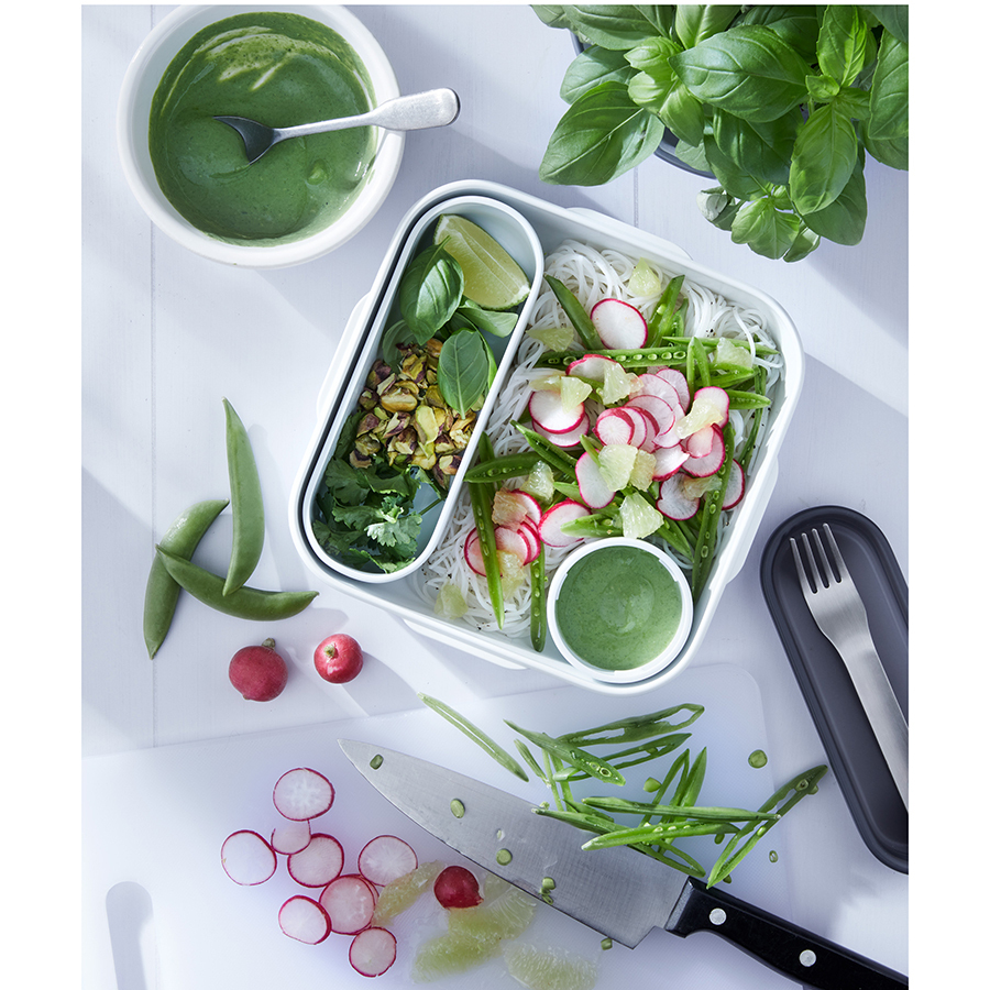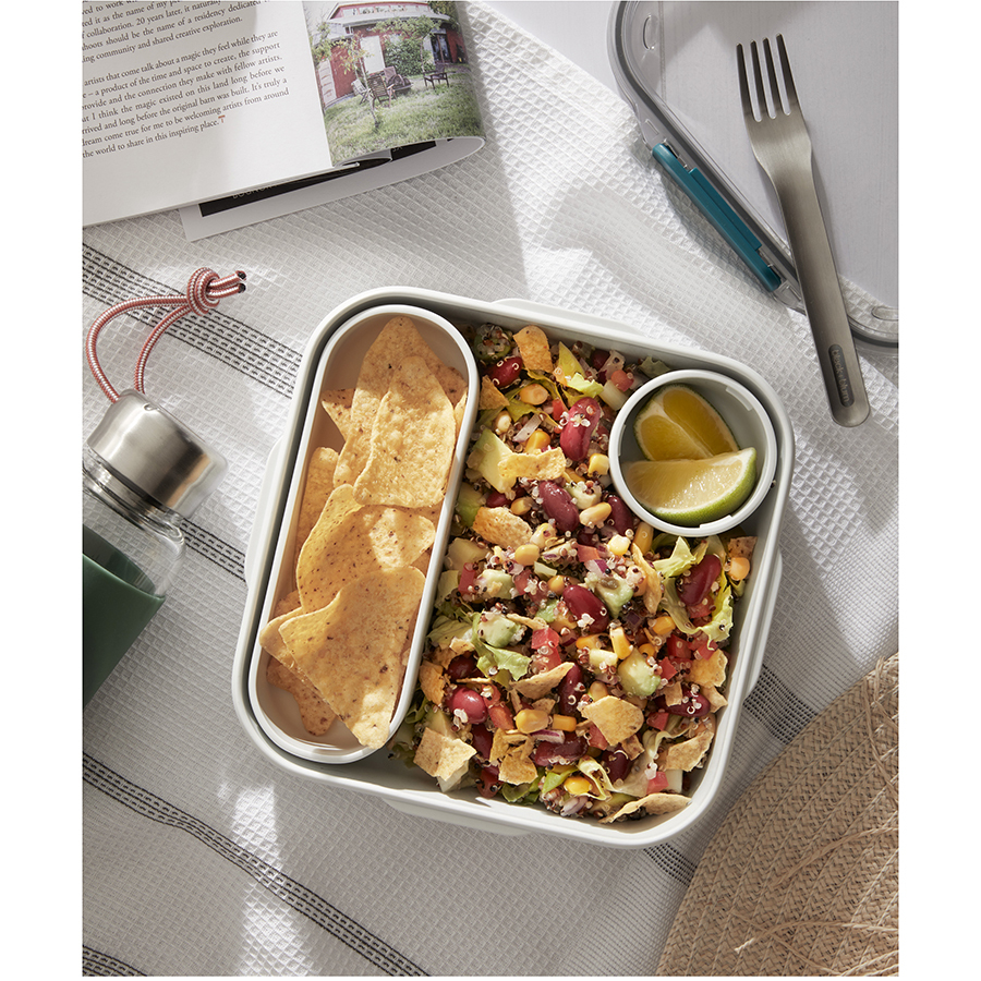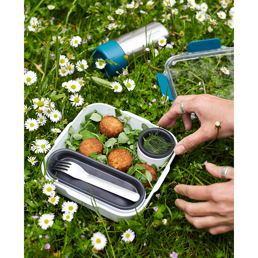 Стильный ланч-бокс Original из полипропилена с нержавеющей вилкой, дополнительным контейнером и соусником в комплекте. Аксессуар объемом 1 л не занимает много места в сумке и позволяет вместить завтрак или полноценный обед: мясо, рыбу, гарнир, салат и соус. Верхняя крышка из прозрачного пластика Tritan герметично закрывает ланч-бокс и легко открывается при помощи защелок. Соусник и внутренний контейнер снабжены плотно прилегающими силиконовыми крышками. Ланч-бокс можно хранить в холодильнике и мыть в посудомоечной машине. При разогреве пищи в микроволновой печи верхнюю крышку следует снять.