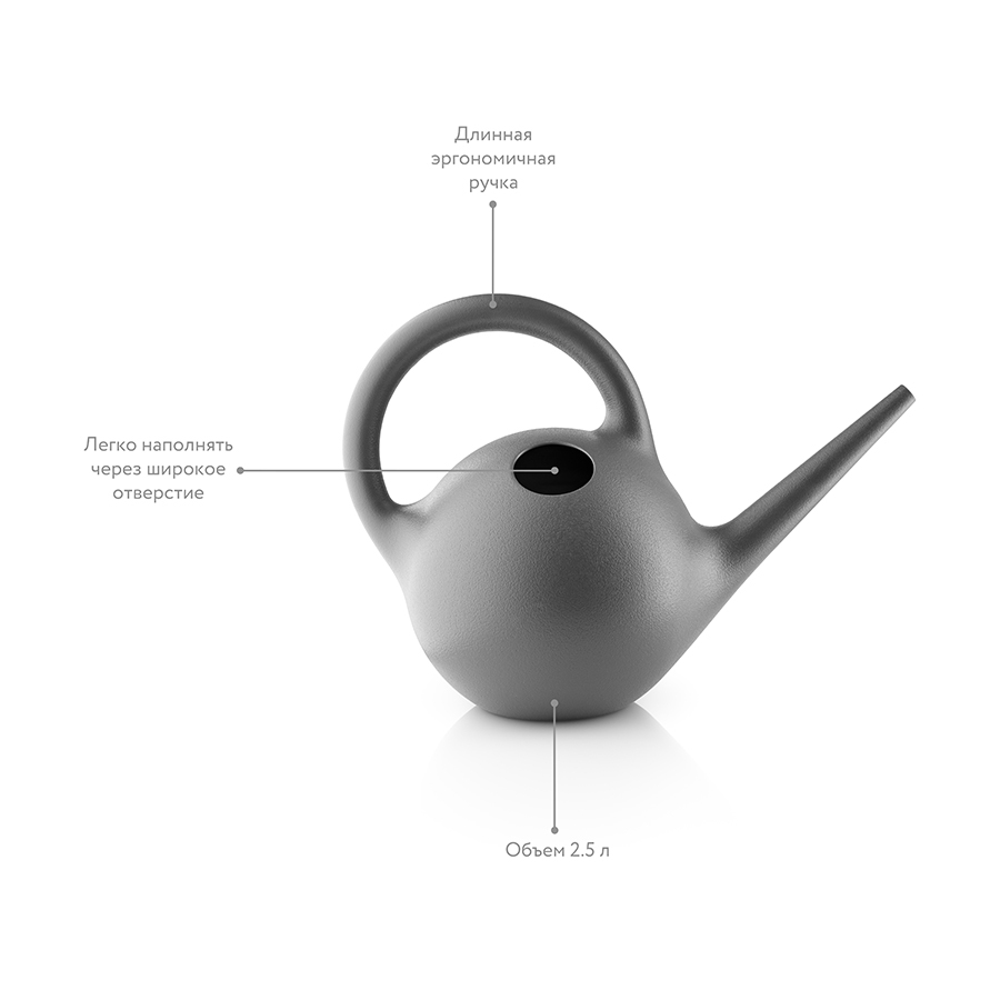 Круглая форма — это удачное и функциональное решение для лейки объемом 2,5 л, чтобы она не казалась громоздкой и ей было удобно пользоваться.