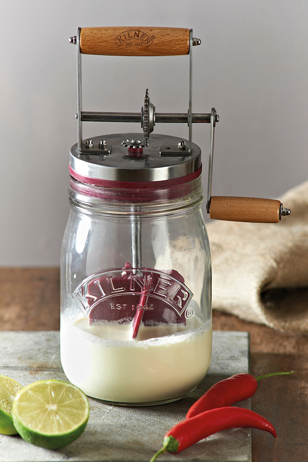Необходимо взять банку, налить в нее жирных сливок, поместить туда механизм для взбивания масла и плотно закрыть крышку. После этого 10 минут вращать ручку до того момента, как сливки разделятся на два слоя: жидкую пахту и готовое сливочное масло, которое после необходимо сформовать и положить в маслёнку. Пахту можно использовать для выпечки.