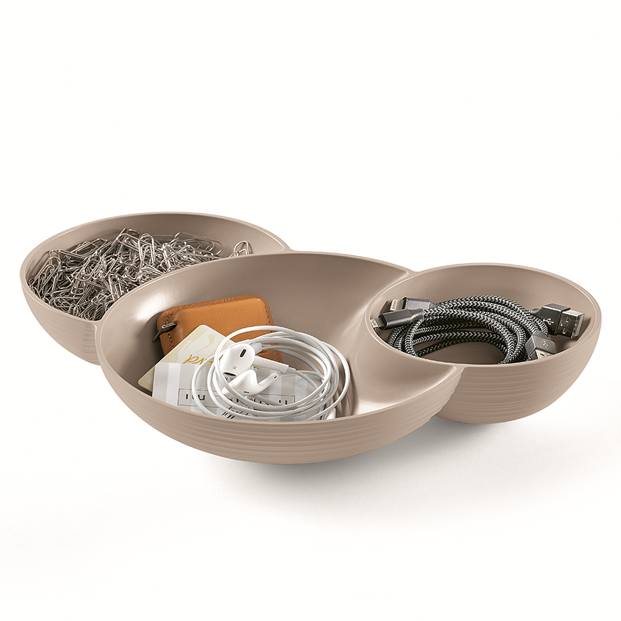 Тройная менажница из переработанного пластика с фактурой, имитирующей глину, подойдет для подачи закусок и снеков.
