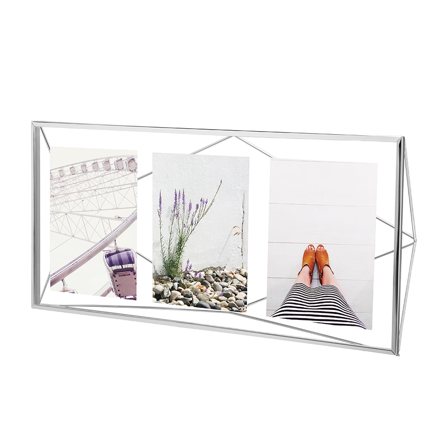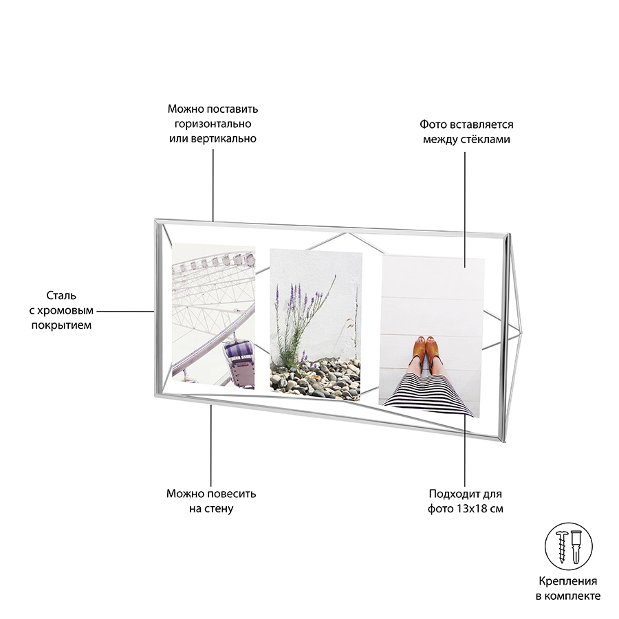 Настоящий алмаз вашей комнаты! Вдохновленная огранкой бриллиантов форма этой рамки привлекает внимание и вызывает восхищение. Но её достоинство в том, что она не отвлекает от главного - от фотографии внутри. Создайте настроение, историю или просто коллаж из лучших воспоминаний, открыток и красивых картинок. Мультирамка вмещает под стеклом три фотографии размером 13 х 18 см. Можно поставить на стол или повесить на стену (крепления в комплекте).