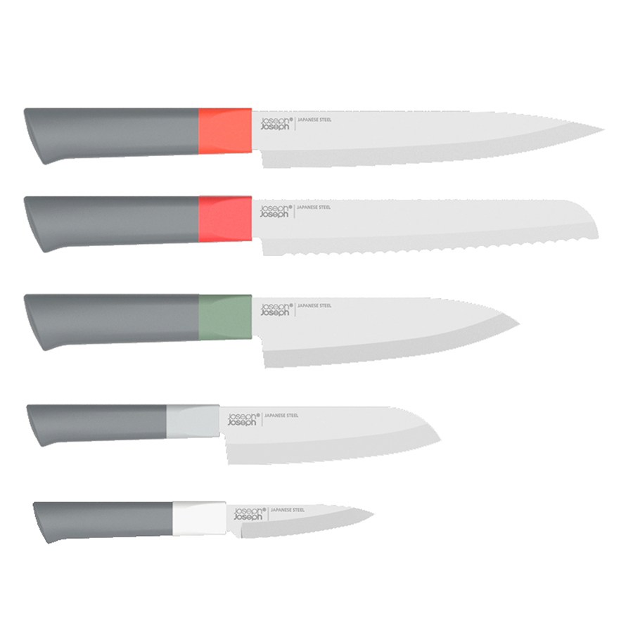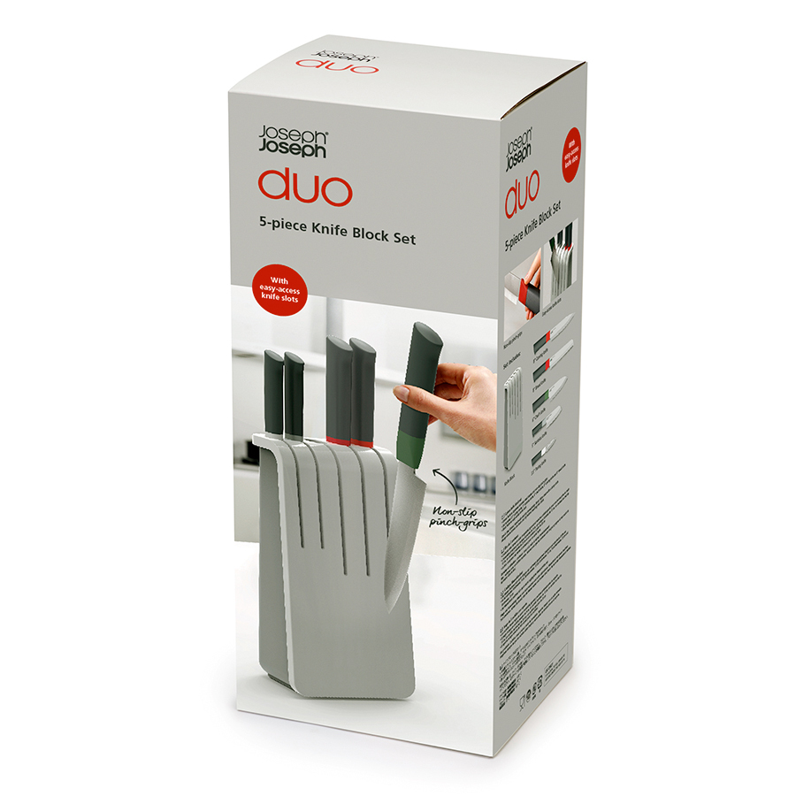 Набор из 5-ти ножей включает в себя нож для овощей (9 см), нож Сантоку (13 см). шеф-нож (15 см), нож для мяса (20 см) и нож для хлеба (20 см). В комплект также входит эргономичная подставка, с помощью которой можно безопасно и компактно хранить ножи. Инструменты будут всегда под рукой, готовые к работе. Особенности и преимущества: - лезвия из японской нержавеющей стали - нескользящие ограничители на рукоятке - эргономичный ручки DUO — новая линейка стильных и эргономичных аксессуаров для кухни от Joseph Joseph. Дизайнеры бренда выявили основные проблемы, возникающие в процессе готовки, и создали уникальную коллекцию DUO для привлечения широкого круга покупателей. Они разработали облегчённый дизайн бестселлеров Joseph Joseph, которые соответствуют самым высоким показателям по практичности и функциональности. Все аксессуары выполнены из высококачественных и прочных материалов и станут фаворитами на любой кухне.