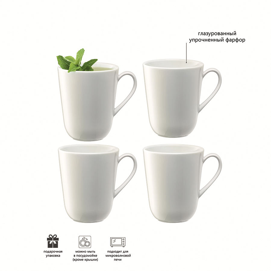 Набор из 4-х кружек прекрасно подойдет для подачи чая, кофе, глинтвейна, какао и других горячих напитков. Объём 380 мл. Кружки прекрасно подойдут для ежедневного использования. Набор упакован в красивую коробку и станет отличным подарком всем любителям кофе и чая. Комбинируйте их вместе с другими предметами из коллекции Dine для создания закоченной композиции. Dine — коллекция фарфоровой посуды, сочетающей в себе классику и современный дизайн. В линейке представлены тарелки, чашки, блюдца, миски, блюда, заварочные чайники, сахарницы, маслёнки, молочники и другие предметы для изысканной сервировки. Все элементы коллекции можно комбинировать между собой в зависимости от случая. Изделия из фарфора можно использовать в микроволновой печи и мыть в посудомоечной машине.