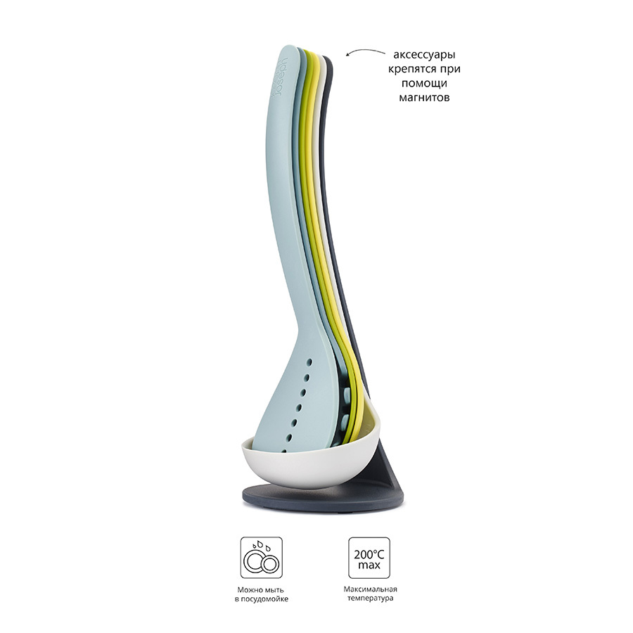 Аксессуары надежно крепятся друг к другу благодаря небольшим магнитам, встроенным в рукоятки. Набор Elevate устойчив к механическим повреждениям и выдерживает температуру до 200°.