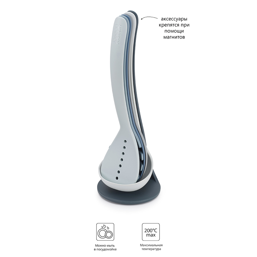 Аксессуары надежно крепятся друг к другу благодаря небольшим магнитам, встроенным в рукоятки. Набор Elevate устойчив к механическим повреждениям и выдерживает температуру до 200°.