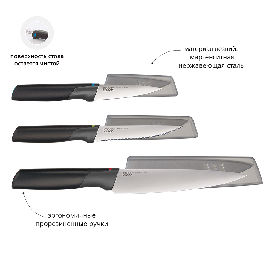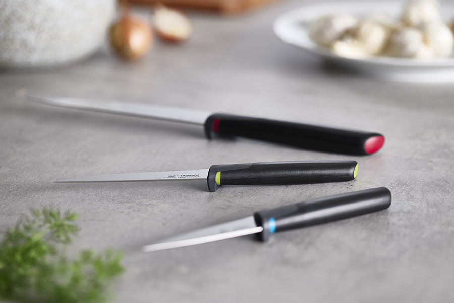 Ножи идеальны для ежедневного использования: острые лезвия изготовлены из мартенситной нержавеющей стали, которая обеспечивает устойчивость к коррозии и легкую заточку. Дизайн ножей разработан с целью минимизировать беспорядок, возникающий во время готовки. Благодаря специальным утяжелителям, встроенным в рукоятки, лезвия всегда остаются навесу, не загрязняя поверхность. Аксессуары поступают в продажу в защитных ножнах для безопасного хранения.
