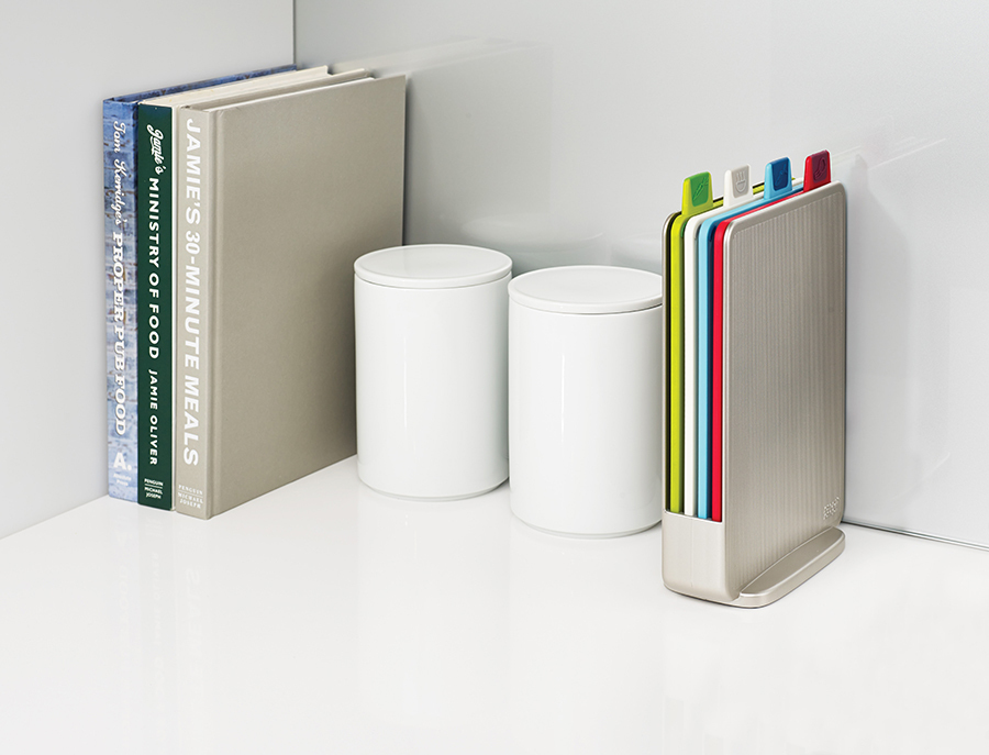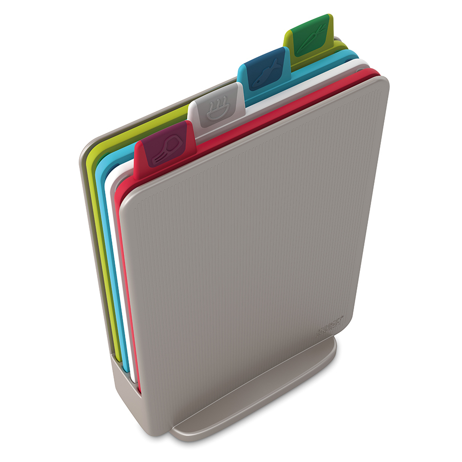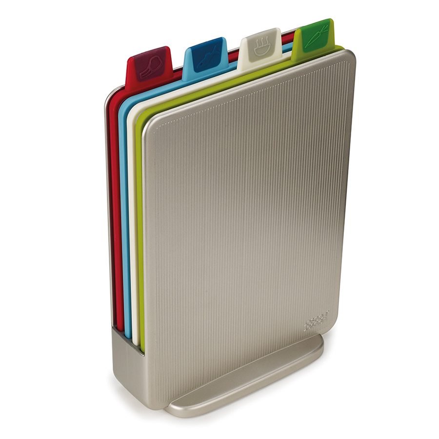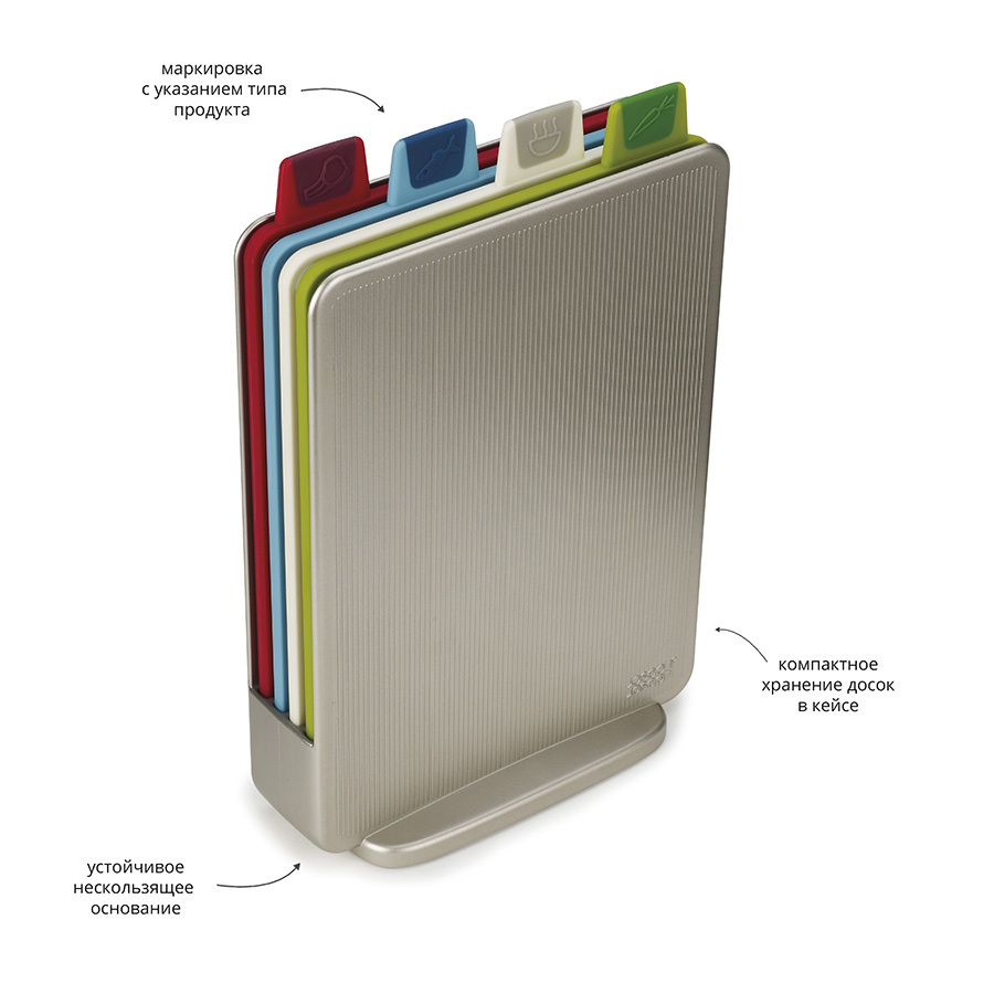 Благодаря компактным размерам набор Index Mini очень удобен для нарезания небольших порций продуктов и экономии кухонного пространства. Миниатюрные доски хранятся в удобном кейсе. Специальные ярлыки позволяют определить, какую доску следует использовать для какого типа продуктов: сырого мяса, овощей, рыбы или же готовой еды. Все доски располагают нескользящим основанием и желобками для жидкости и случайных кусков. Специальный материал, из которого изготовлены доски, практически не затупляет ножи и при резке не оставляет микроскопических частиц на продуктах. Доски можно мыть в посудомоечной машине. Кейс рекомендуется чистить вручную влажной тканью. Размер разделочных досок: длина 21, высота 15, диагональ 24,5 см.