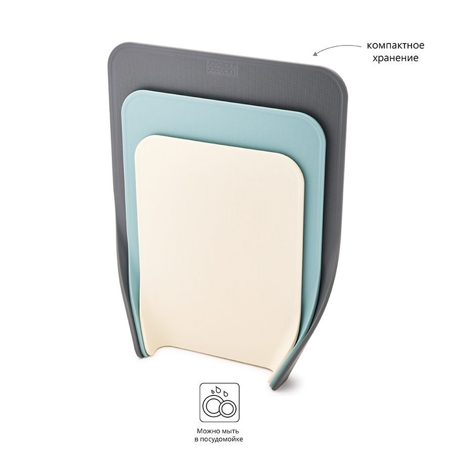 Текстурированная поверхность препятствует прилипанию кусочков пищи, а закругленные края помогут ссыпать продукты точно в посуду. Нескользящая основа обеспечит устойчивость при использовании. Доски плотно прилегают друг к другу для компактного хранения и устанавливаются вертикально для лучшей организации пространства.