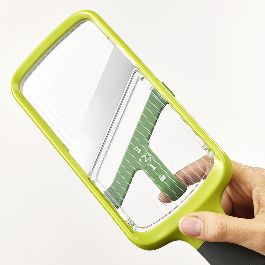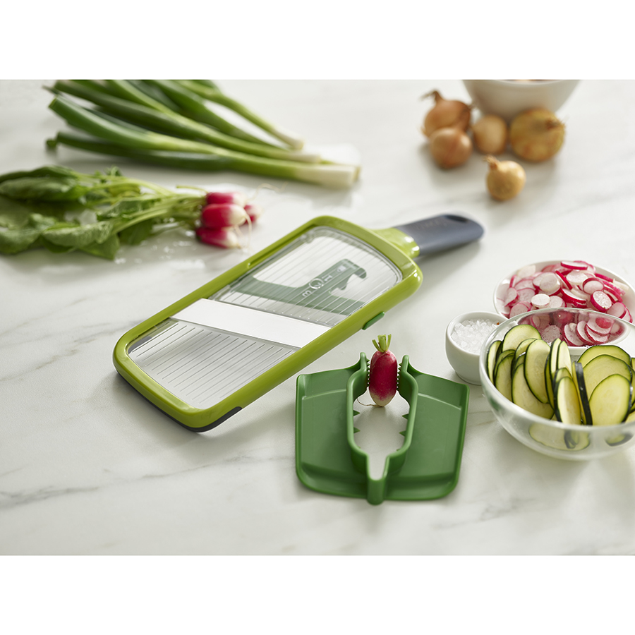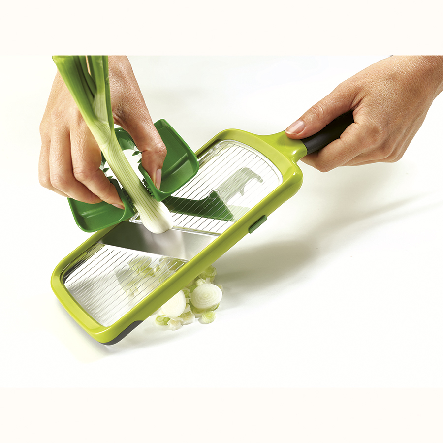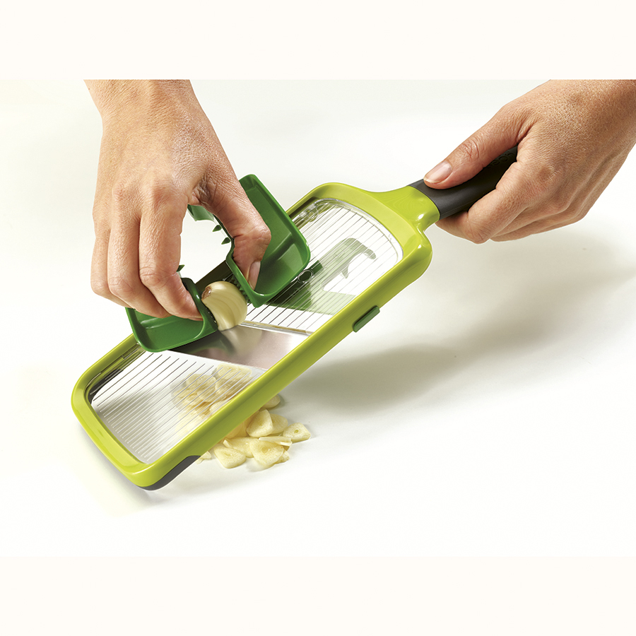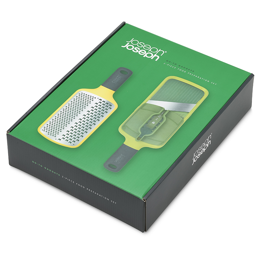 В набор входят: терка с держателем для продуктов Mandoline и тёрка с двумя лезвиями Multi-Grate.