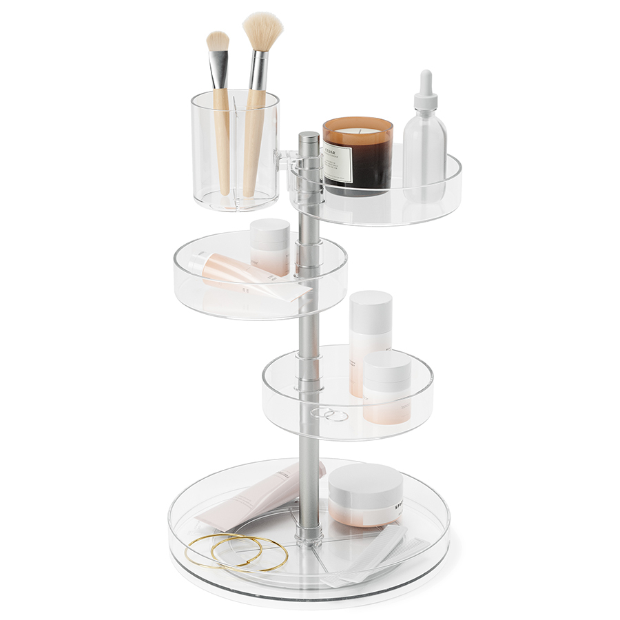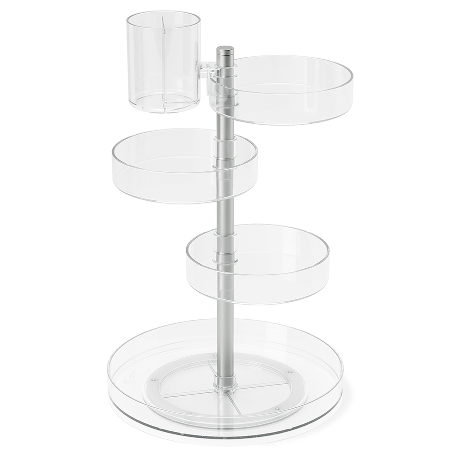 Каждая из секций вращается на 360 градусов. Высоту полок можно регулировать. Органайзер изготовлен из прочного акрила.