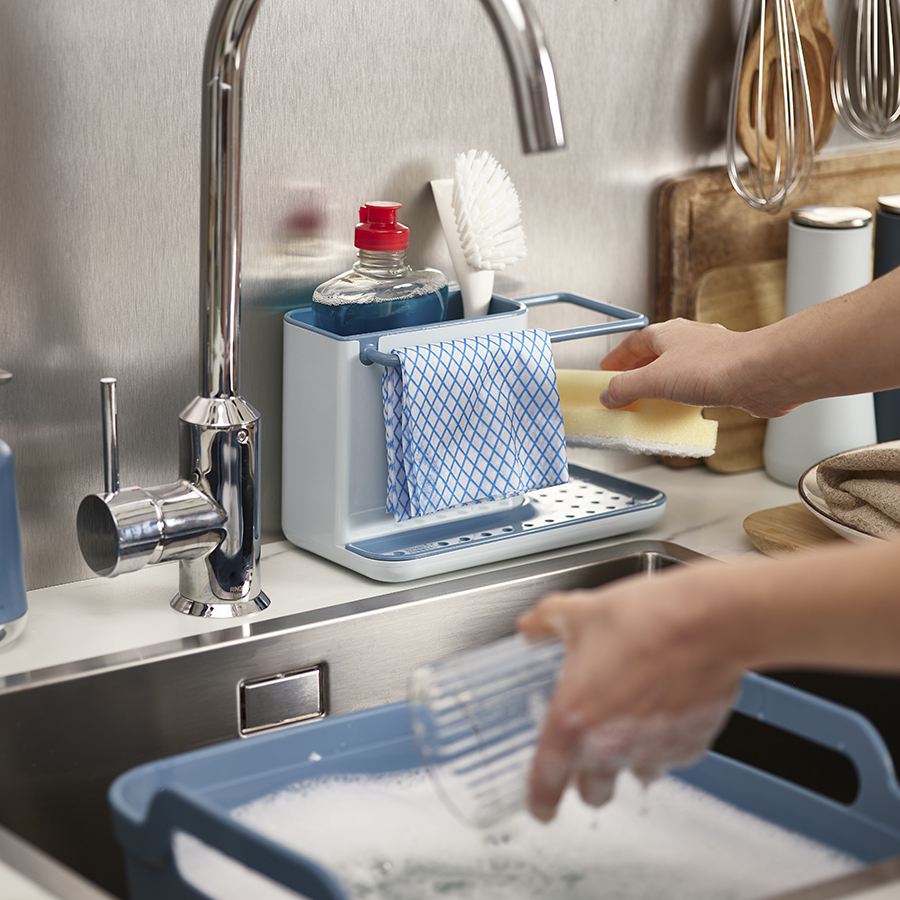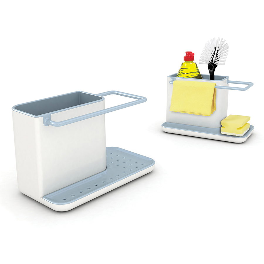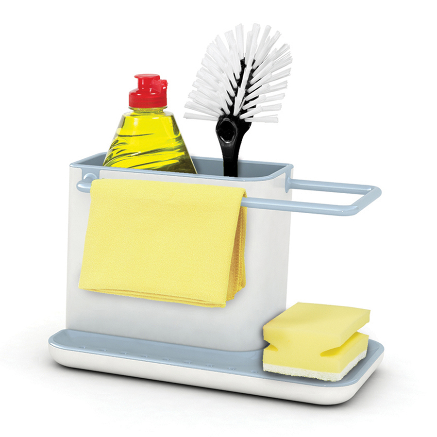 Вместительная основная ёмкость органайзера предназначена для хранения щеток и бутылок со средствами для мытья. На вешалке, расположенной вдоль ее внешнего края, удобно сушить небольшие тряпки. Широкий поддон с отверстиями предоставляет место для просушивания губок, а скрывающийся под ним резервуар аккуратно собирает стекающую воду. Органайзер легко собирается и разбирается для чистки.