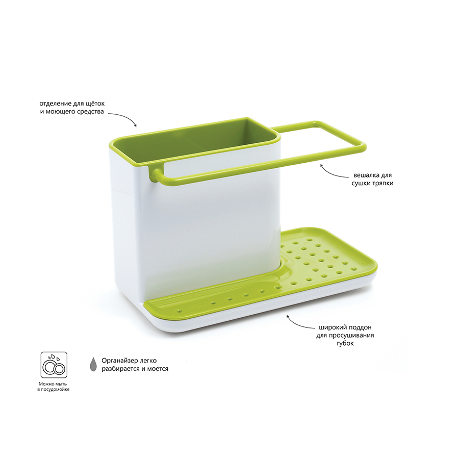 Безусловный хит категории продуктов для уборки и хранения. Вместительная основная ёмкость органайзера предназначена для хранения щеток и бутылок со средствами для мытья. На вешалке, расположенной вдоль ее внешнего края, удобно сушить небольшие тряпки. Широкий поддон с отверстиями предоставляет место для просушивания губок, а скрывающийся под ним резервуар аккуратно собирает стекающую воду. Органайзер легко собирается и разбирается для чистки. Можно мыть в посудомоечной машине.