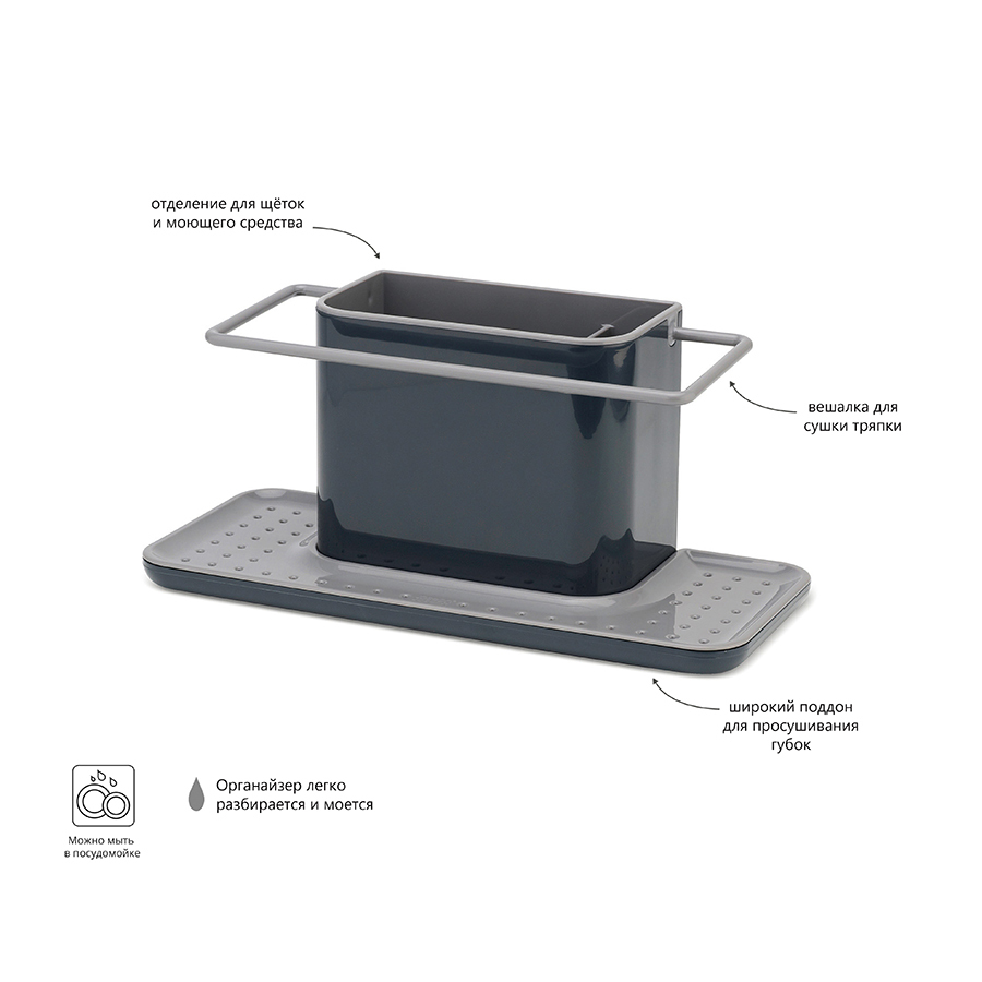 С этим практичным предметом процесс мытья посуды становится продуманным как никогда раньше. Вместительная основная ёмкость предназначена для хранения щёток и бутылок со средствами для мытья. На вешалке, расположенной вдоль её внешнего края, удобно сушить небольшие тряпки. Широкий поддон с отверстиями предоставляет место для просушивания губок, а скрывающийся под ним резервуар аккуратно собирает стекающую воду. Органайзер легко собирается и разбирается для чистки. Можно мыть в посудомоечной машине.