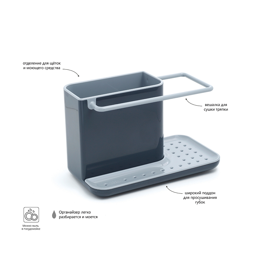 Безусловный хит категории продуктов для уборки и хранения. Вместительная основная ёмкость органайзера предназначена для хранения щеток и бутылок со средствами для мытья. На вешалке, расположенной вдоль ее внешнего края, удобно сушить небольшие тряпки. Широкий поддон с отверстиями предоставляет место для просушивания губок, а скрывающийся под ним резервуар аккуратно собирает стекающую воду. Органайзер легко собирается и разбирается для чистки. Можно мыть в посудомоечной машине.