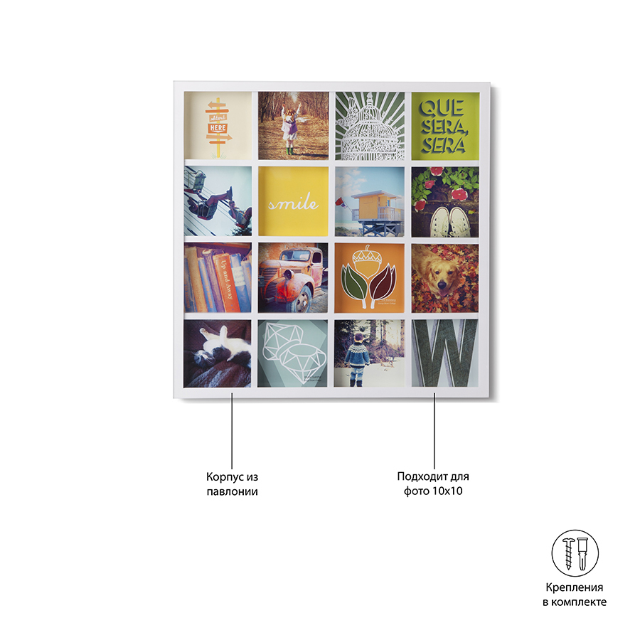 Одно фото - это ценное воспоминание об отпуске или о счастливом моменте в кругу близких. Но для воссоздания атмосферы больше - лучше! Панно для 16 фотографий поможет вам создать коллаж из самых счастливых жизненных моментов. Можно использовать фотографии, открытки, письма, вырезки из журналов и карты - настоящий полет фантазии! Размер каждого фото - 10,2 х 10,2 см (просто обрежьте стандартные фотографии и поместите их под стекло).