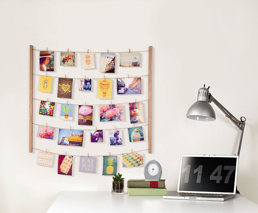 Снимки, открытки, детские рисунки, письма и крепятся на 5 нитях, имитирующих бельевую верёвку. 40 деревянных прищепок идут в комплекте. Композицию легко менять под настроение.