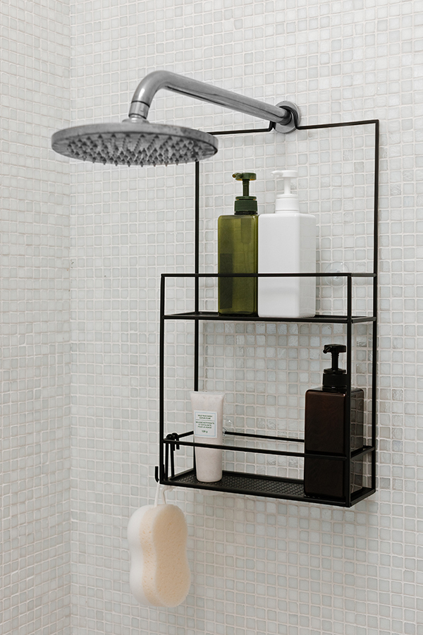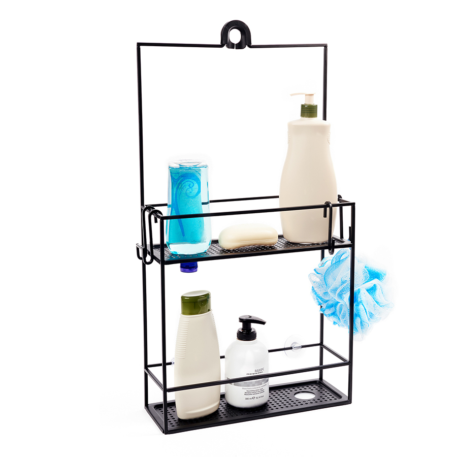 Оснащен двумя вместительными полками для душевых принадлежностей и четырьмя S-образными крючками для губок и других мелочей. В полках предусмотрены специальные отверстия для стекания воды. Может крепиться к стене при помощи присосок или подвешиваться за прорезиненный крючок.