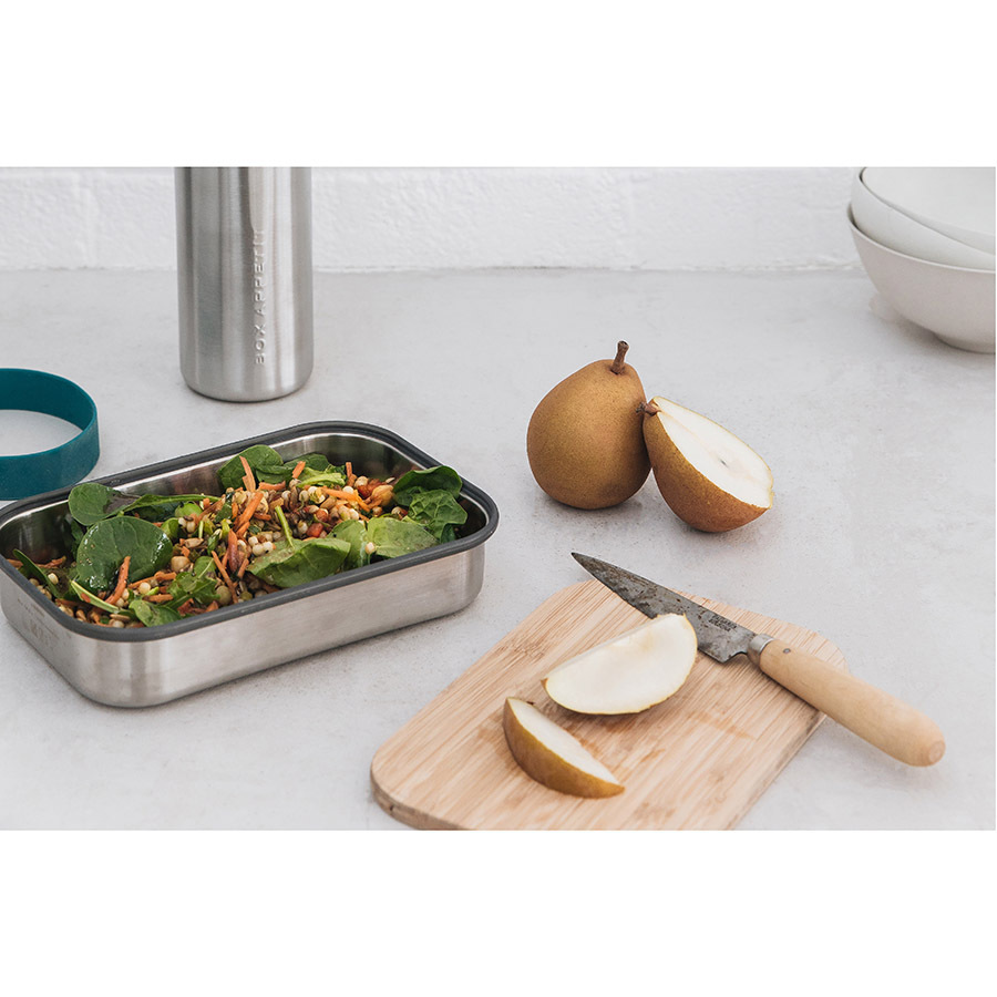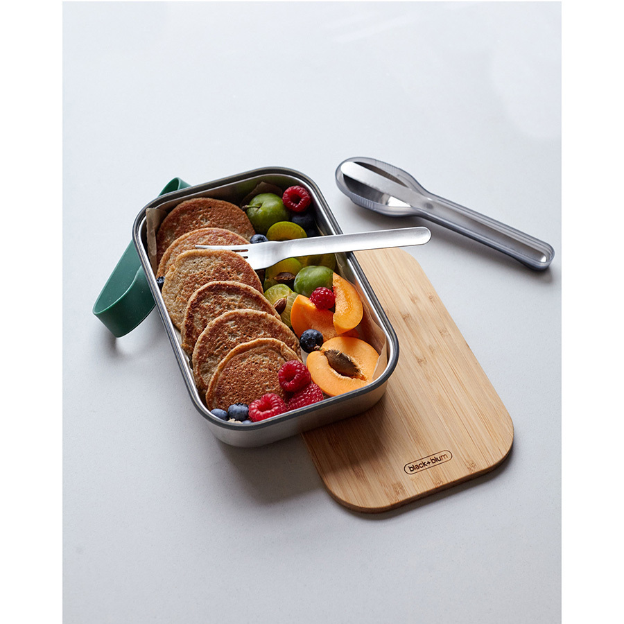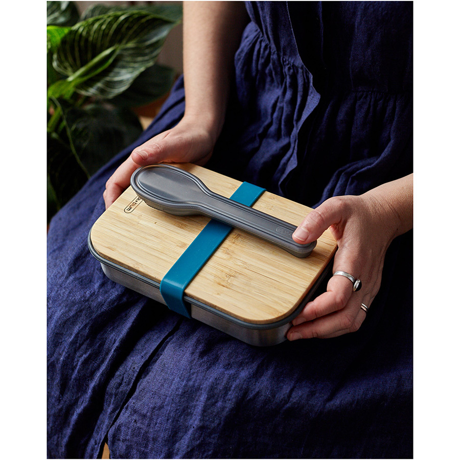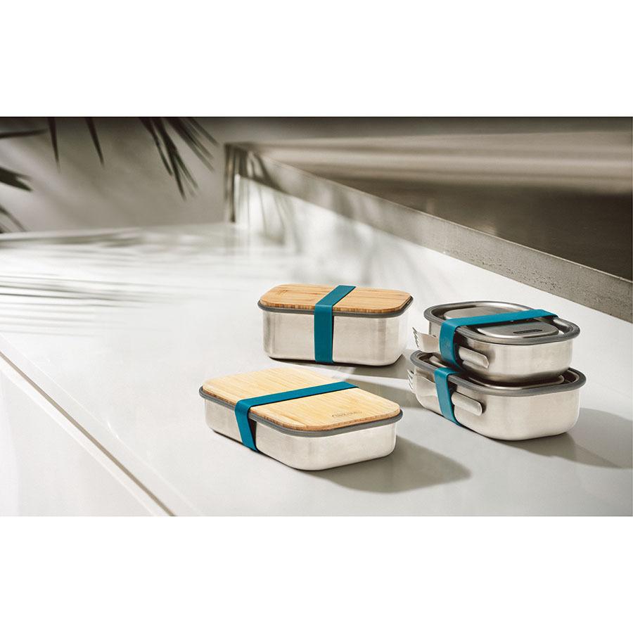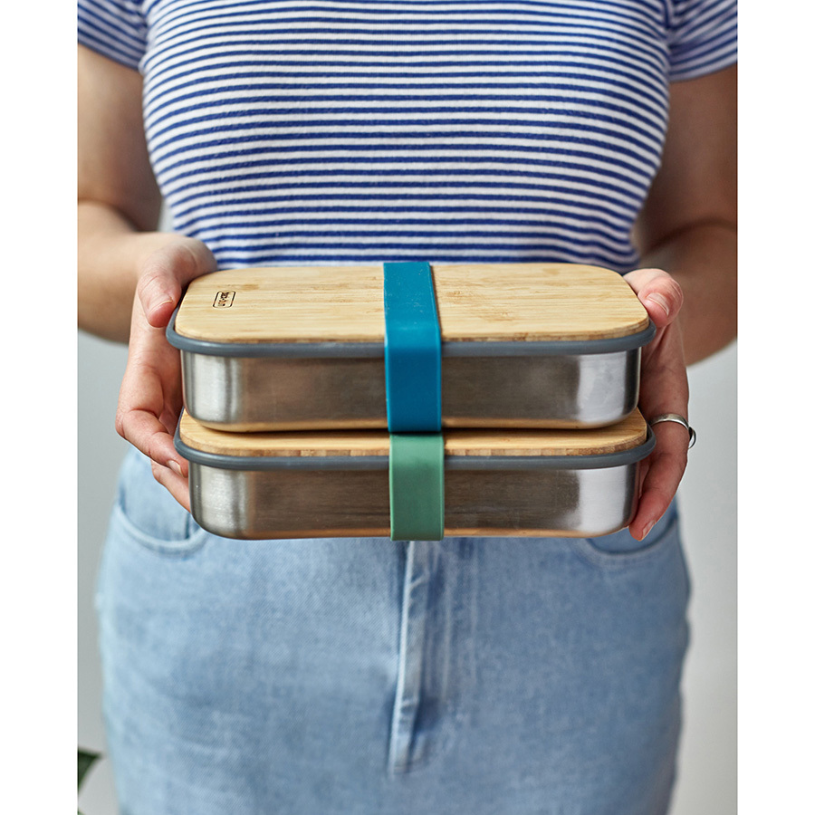Удобная коробка для сэндвичей из нержавеющей стали, дополненная бамбуковой крышкой и силиконовой лентой бирюзового цвета. Коробка подходит для хранения как уже готовых сэндвичей, так и отдельных продуктов, входящих в их состав. Антибактериальные свойства бамбука позволяют использовать крышку коробки в качестве разделочной доски, на которой блюдо можно приготовить непосредственно перед подачей. Корпус бокса выполнен из нержавеющей стали, он сохранит свой внешний вид даже в сложных условиях эксплуатации. Силиконовая лента-перетяжка герметично зафиксирует крышку. Она легко моется и также очень долговечна. Сэндвич-бокс Black+Blum – удобное решение для тех, кто покупным предпочитает свежие сэндвичи из-под ножа. Самые оригинальные ингредиенты теперь можно взять с собой и приготовить изысканный деликатес в любом удобном месте: в офисе, школе, университете или прямо на траве во время пикника. Красивый и стильный он выделит своего обладателя из толпы и покажет его как человека, разбирающегося в хорошем дизайне. Основой же этих преимуществ станет высокое качество материалов, благодаря которому сэндвич-бокс прослужит долгие годы.