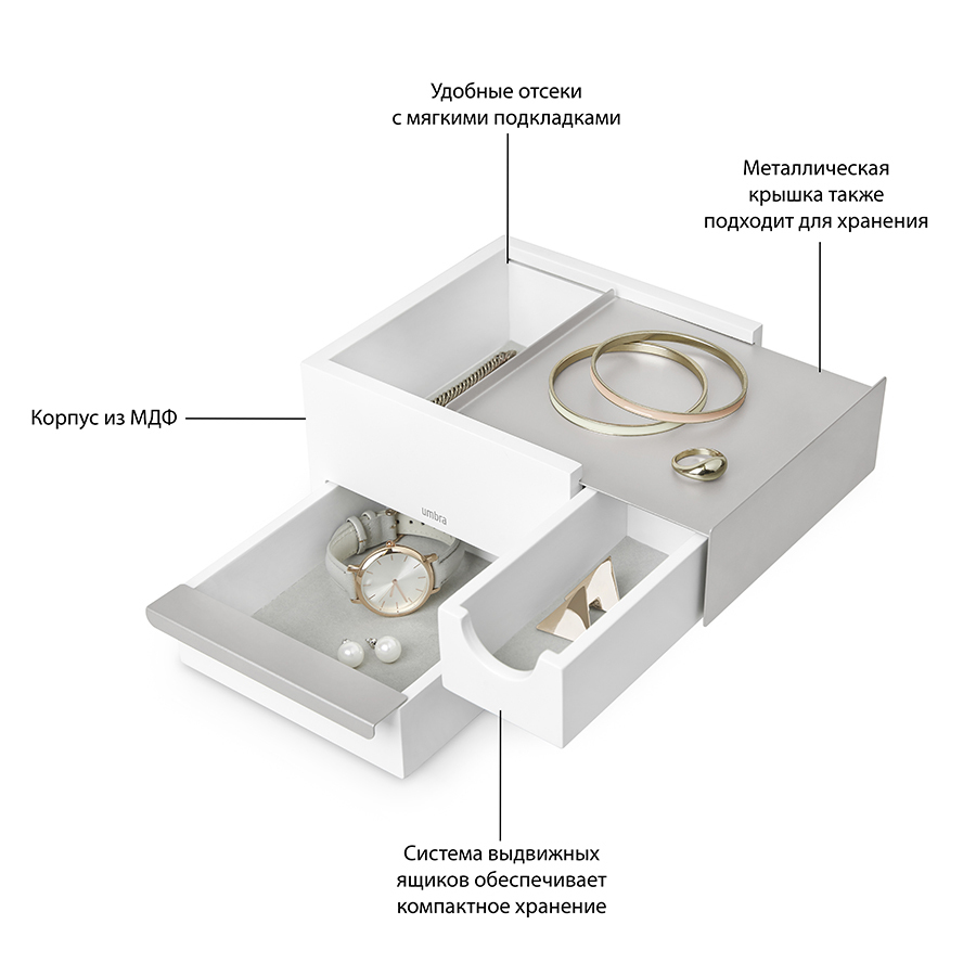 Компактная версия популярной шкатулки для украшений Stowit. Два больших отделения для хранения крупных предметов — колец, браслетов, часов, и один небольшой "потайной" ящичек для запонок, серёжек или цепочек. Сочетание древесной фактуры и белого металла делает шкатулку типичным представителем скандинавского модернизма. Дизайн: Sung wook Park