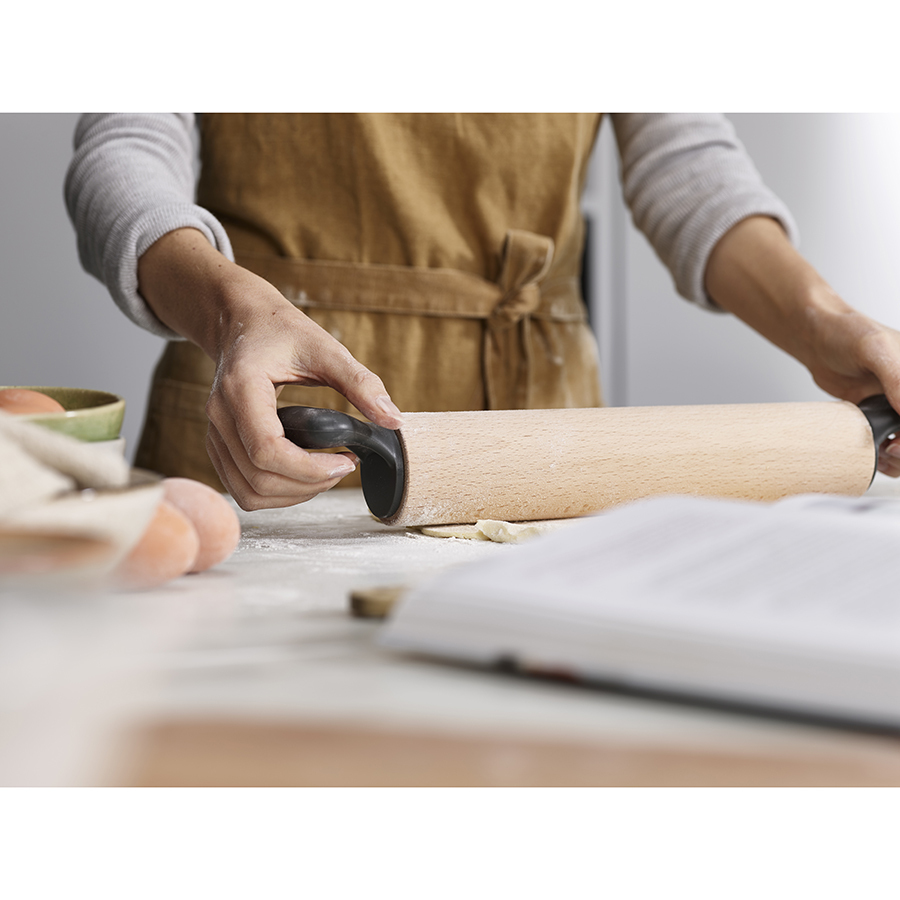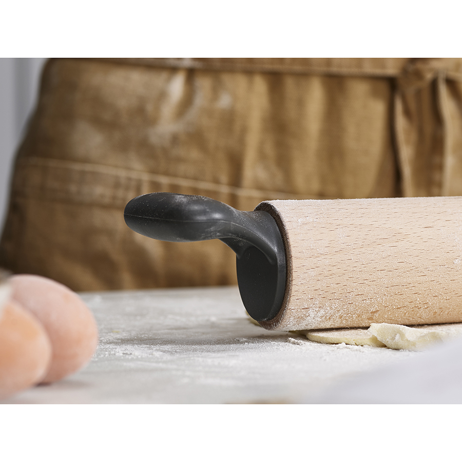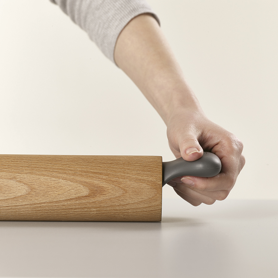 Деревянная скалка Grip Pin Grey из бука используется для раскатывания теста. Инструмент имеет широкие ручки с фигурными контурами, которые обеспечивают удобную опору для рук, а также предотвращают удары костяшками пальцев о столешницу во время работы. Дизайн разработан так, что скалка не скатывается с рабочей поверхности во время паузы. Отверстие в ручке служит для удобного хранения в подвешенном состоянии.