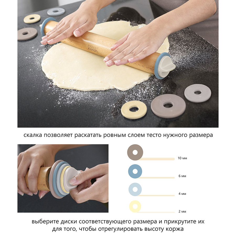 Инновационная скалка предназначена для раскатывания равномерного слоя теста для печенья, пиццы и прочей выпечки. В набор входят четыре комплекта съемных дисков, которые поднимают скалку на разную высоту, позволяя регулировать толщину получаемых коржей: 2 мм, 4 мм, 6 мм или 10 мм. Продуманная конструкция гарантирует равномерную толщину теста, а нанесенная на скалку разметка позволит определить ширину коржа.