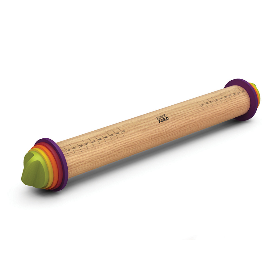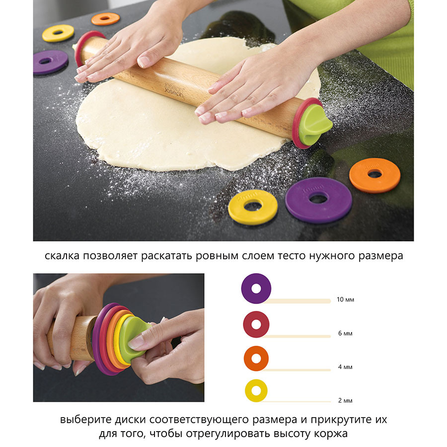 В набор входят четыре комплекта съемных дисков, которые поднимают скалку на разную высоту, позволяя регулировать толщину получаемых коржей: 2 мм, 4 мм, 6 мм или 10 мм. Продуманная конструкция гарантирует равномерную толщину теста, а нанесенная на скалку разметка позволит определить ширину коржа.