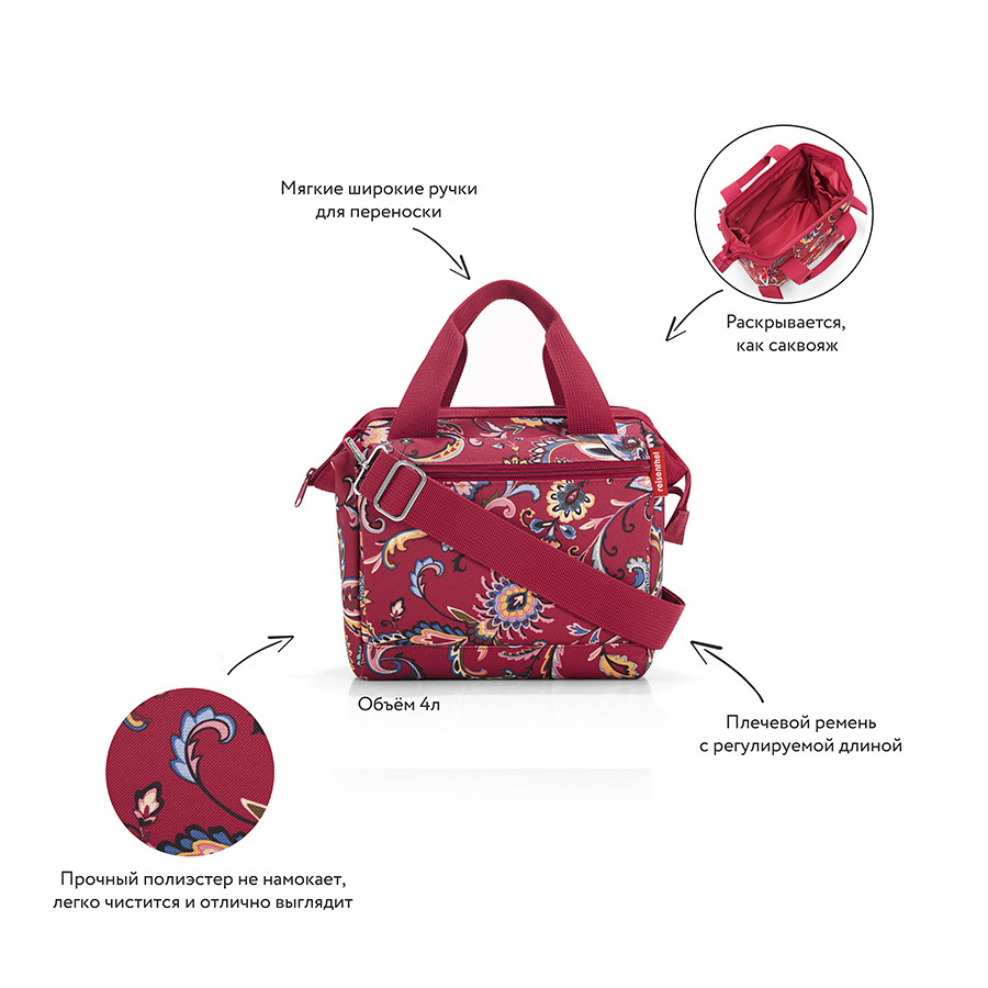 Помимо просторного основного отделения, который отделан мягкой подкладкой и закрывается на молнию, в сумке есть 3 внутренних и 2 наружных кармана. Мягкие широкие ручки и удобный ремешок с регулировкой длины позволяют носить сумку в обхвате ладонью или через плечо. Для производства изделия мастера используют качественный полиэстер с водоотталкивающим покрытием. Сумка устойчива на разрыв и легко поддается чистке. Объём: 4 литра.