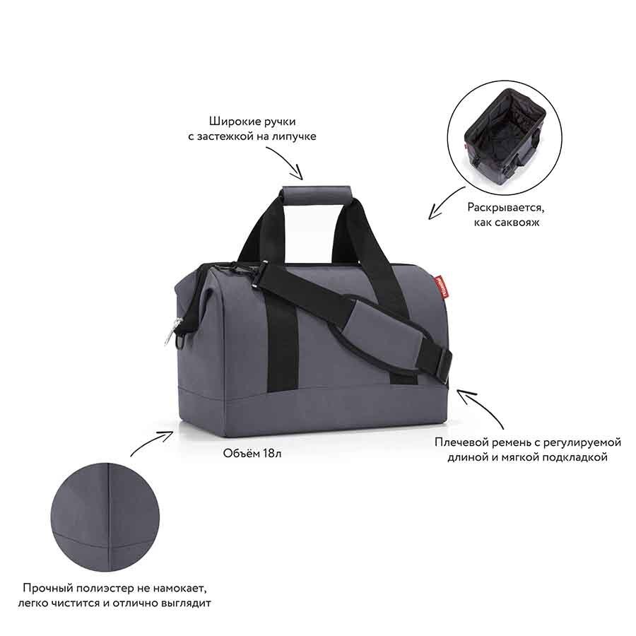 Сумка хоть куда - и в путешествие, и в спортзал. Вместит всё, от носков до пиджака. Приятные объемные стенки и дно создают силуэт, напоминающий старинные врачебные сумки. Застегивается на молнию, плюс внутрь встроены металлические скобы, фиксирующие её в открытом состоянии. Внутри 6 кармашков для организации вещей. Две удобные ручки и ремень регулируемой длины позволяют носить сумку так, как вам удобно. Объем - 18 литров.