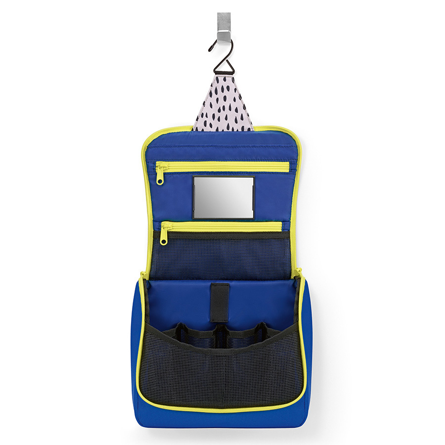 Внутри сумки 1 основное отделение и 4 кармана. На крышке с внутренней стороны 2 кармана на молнии. Также можно прикрепить зеркало на липучку или снять его. Специальный крючок позволяет подвесить сумку в ванной и облегчить доступ к косметике и аксессуарам. Материал – прочный водоотталкивающий полиэстер, выполненный из переработанных пластиковых бутылок. Объем – 3 л.