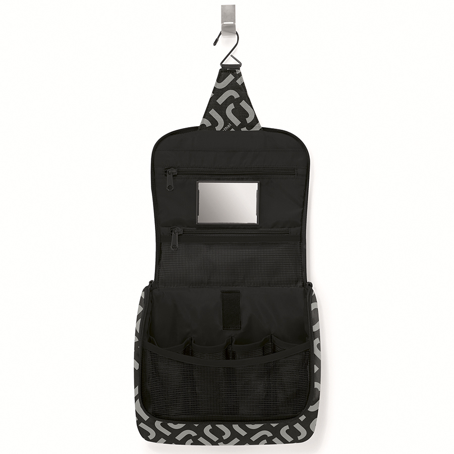Внутри сумки 1 основное отделение и 4 кармана. На крышке с внутренней стороны 2 кармана на молнии. Также можно прикрепить зеркало на липучку или снять его. Специальный крючок позволяет подвесить сумку в ванной и облегчить доступ к косметике и аксессуарам. Материал – прочный водоотталкивающий полиэстер. Объем – 3 л.