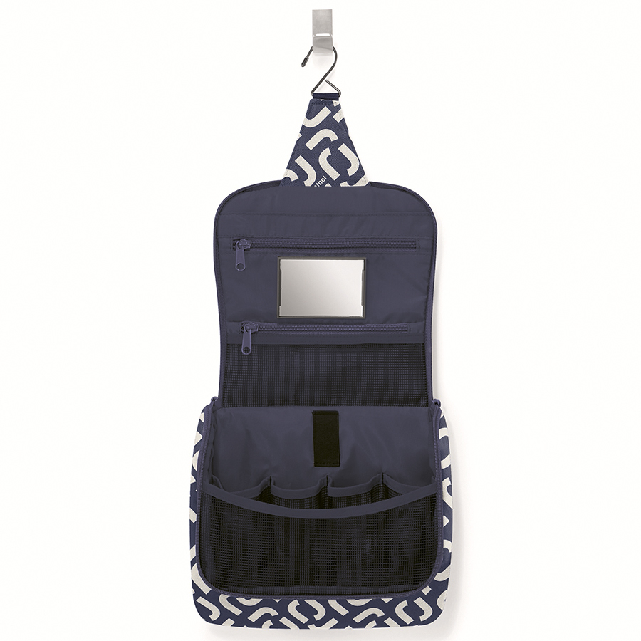 Внутри сумки 1 основное отделение и 4 кармана. На крышке с внутренней стороны 2 кармана на молнии. Также можно прикрепить зеркало на липучку или снять его. Специальный крючок позволяет подвесить сумку в ванной и облегчить доступ к косметике и аксессуарам. Материал – прочный водоотталкивающий полиэстер. Объем – 3 л.