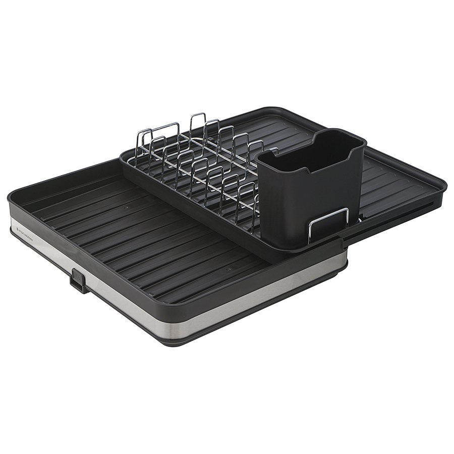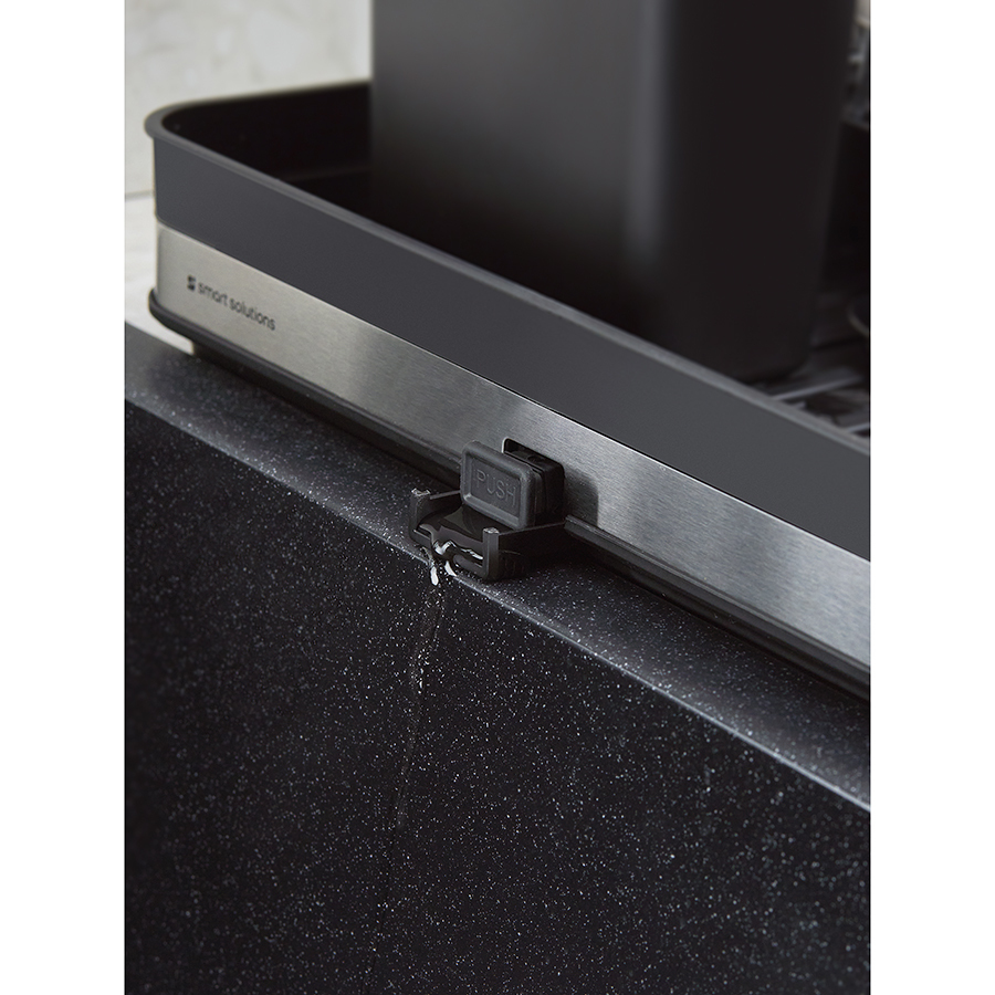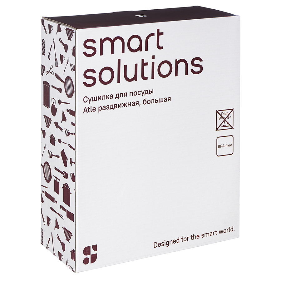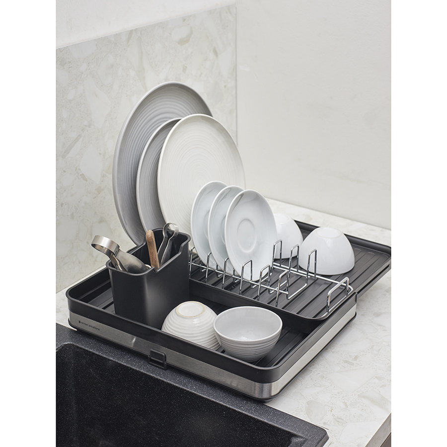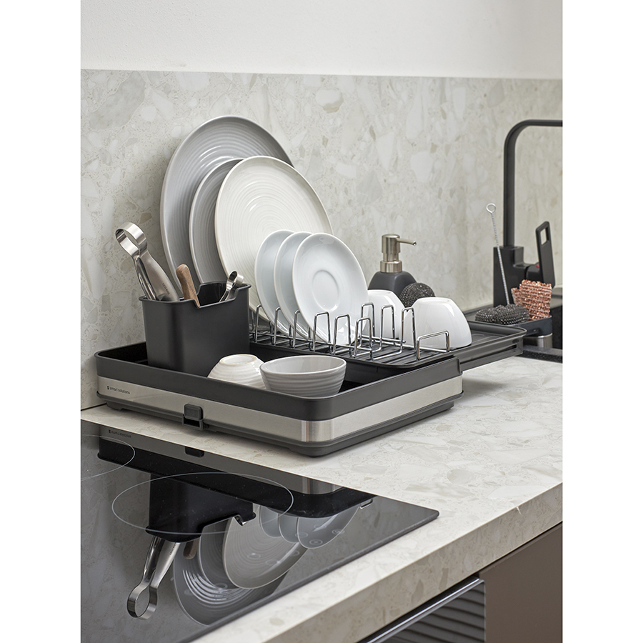 Сушилка Atle – компактная, но в то же время вместительная модель с раздвижной конструкцией, в которой предусмотрены отделения для посуды и кухонных принадлежностей. Удобное размещение и надежную фиксацию тарелок и других емкостей обеспечивают железные разделители. Поддон выполнен из практичного полипропилена, который легко моется. Стальные элементы на корпусе имеют специальное покрытие против отпечатков пальцев. Настольную сушилку можно размещать в любом месте и для ее установки не требуется делать отверстия в стене. Для хорошей устойчивости в раздвижном состоянии предусмотрены специальные ножки, расположенные в нижней части сушилки, которые выдвигаются одним движением руки.