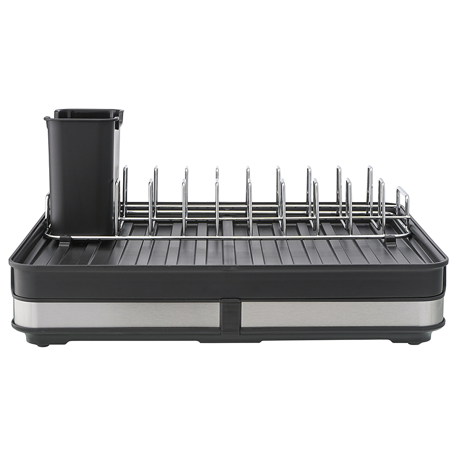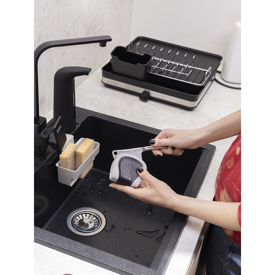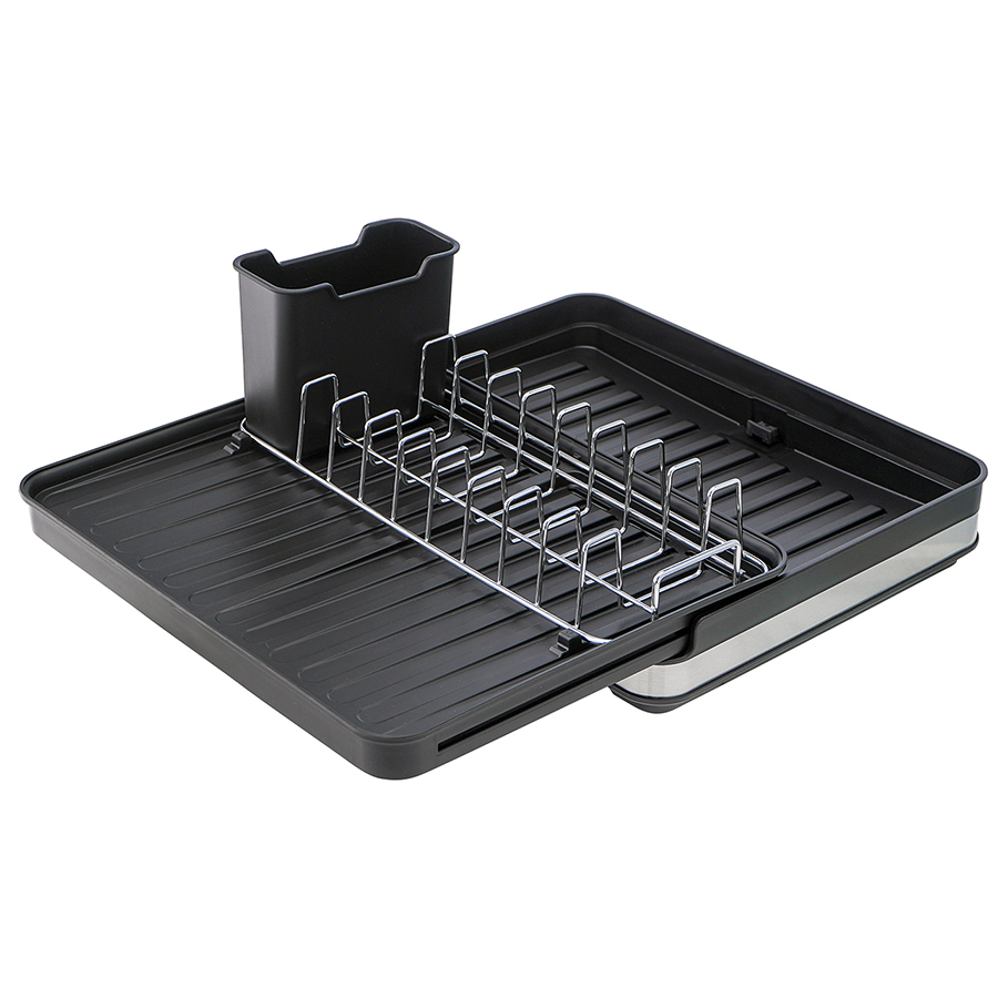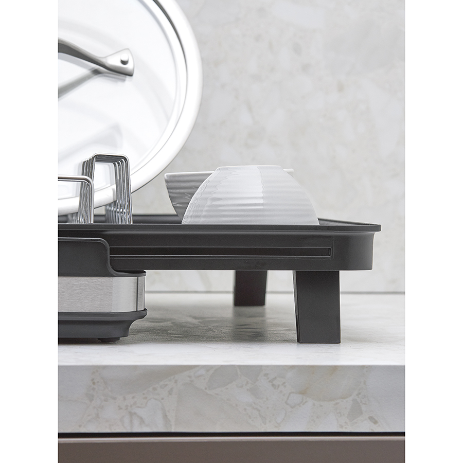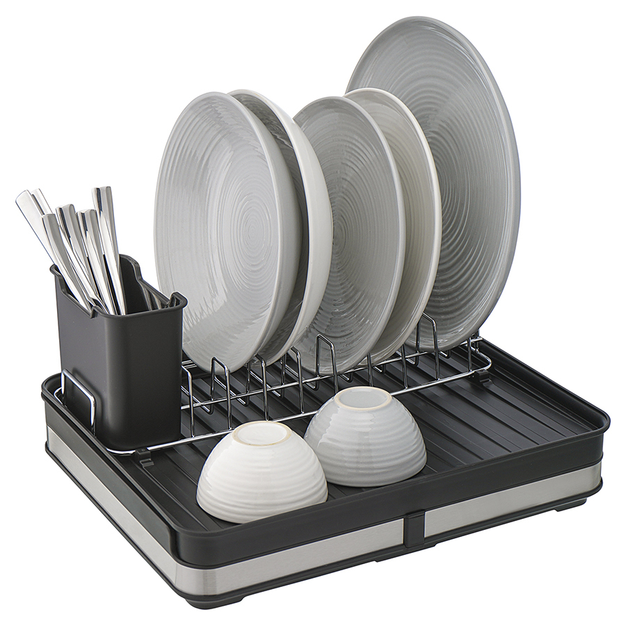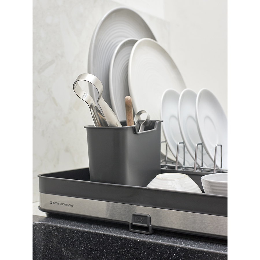 Сушилка Atle – компактная, но в то же время вместительная модель с раздвижной конструкцией, в которой предусмотрены отделения для посуды и кухонных принадлежностей. Удобное размещение и надежную фиксацию тарелок и других емкостей обеспечивают железные разделители. Поддон выполнен из практичного полипропилена, который легко моется. Стальные элементы на корпусе имеют специальное покрытие против отпечатков пальцев. Настольную сушилку можно размещать в любом месте и для ее установки не требуется делать отверстия в стене. Для хорошей устойчивости в раздвижном состоянии предусмотрены специальные ножки, расположенные в нижней части сушилки, которые выдвигаются одним движением руки.