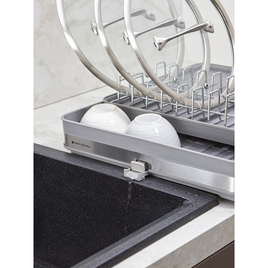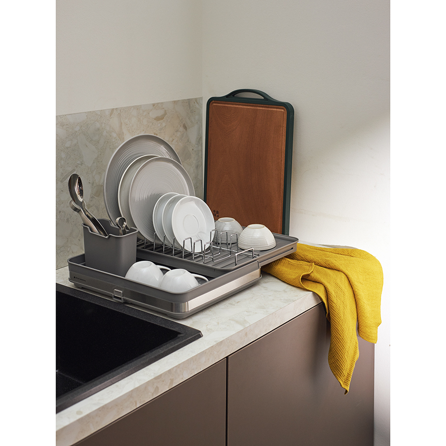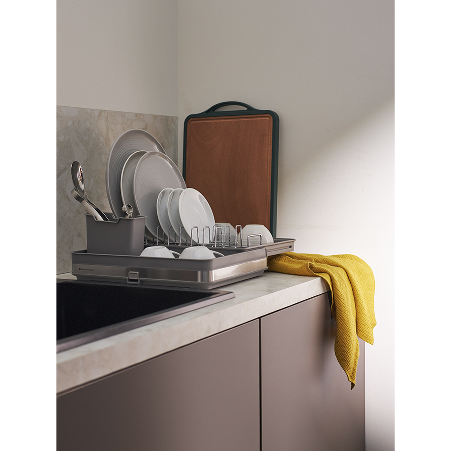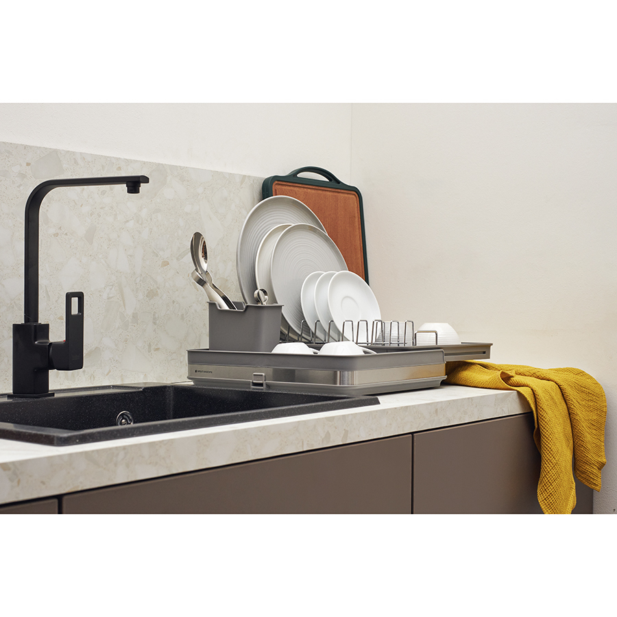 Сушилка Atle – компактная, но в то же время вместительная модель с раздвижной конструкцией, в которой предусмотрены отделения для посуды и кухонных принадлежностей. Удобное размещение и надежную фиксацию тарелок и других емкостей обеспечивают железные разделители. Поддон выполнен из практичного полипропилена, который легко моется. Стальные элементы на корпусе имеют специальное покрытие против отпечатков пальцев. Настольную сушилку можно размещать в любом месте и для ее установки не требуется делать отверстия в стене. Для хорошей устойчивости в раздвижном состоянии предусмотрены специальные ножки, расположенные в нижней части сушилки, которые выдвигаются одним движением руки.