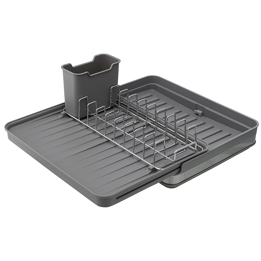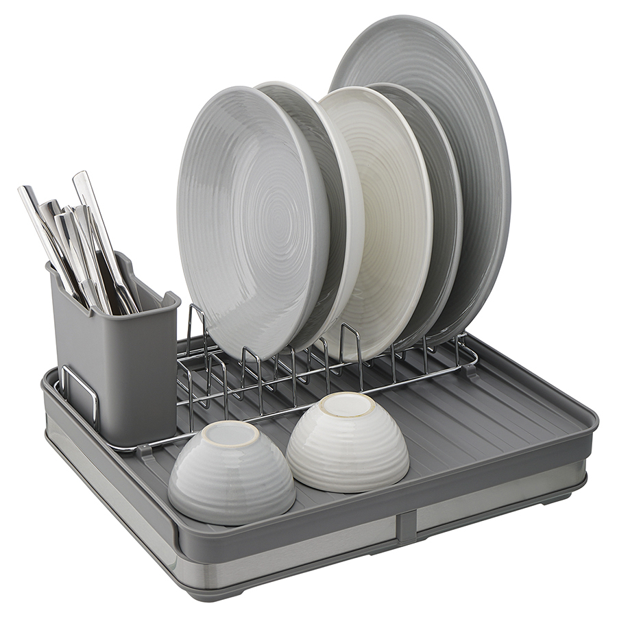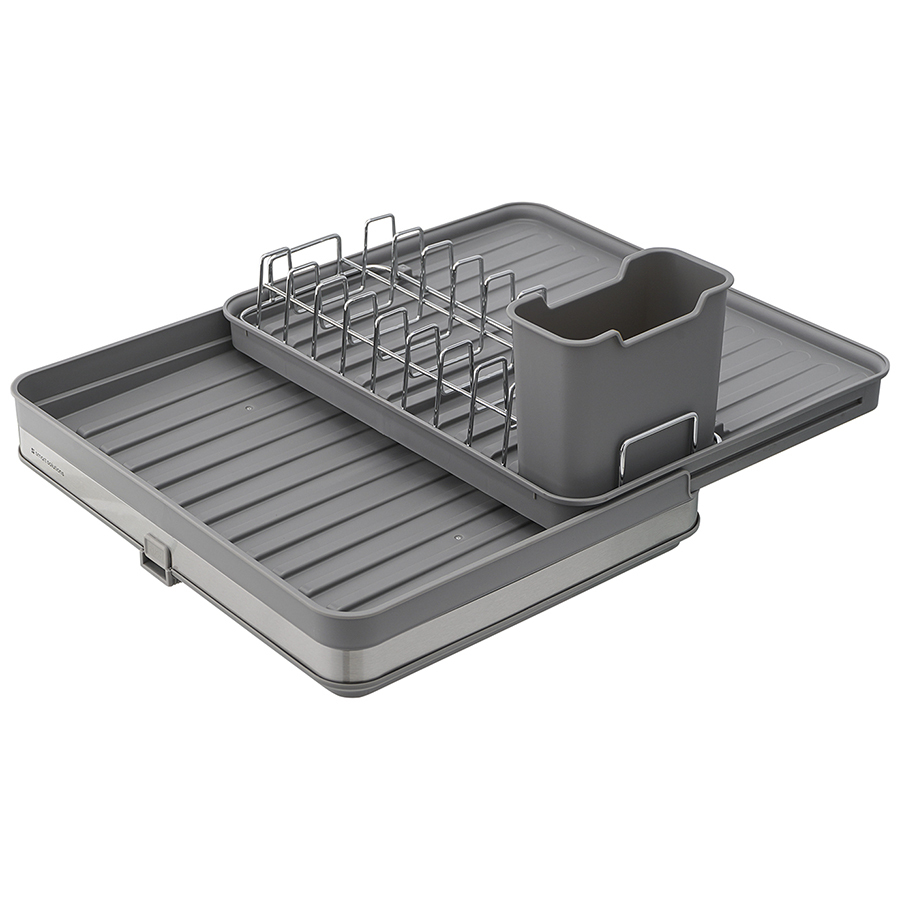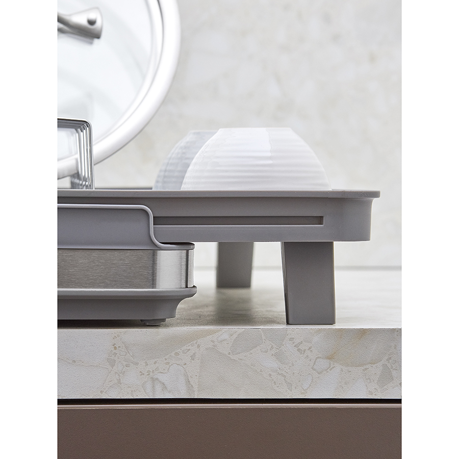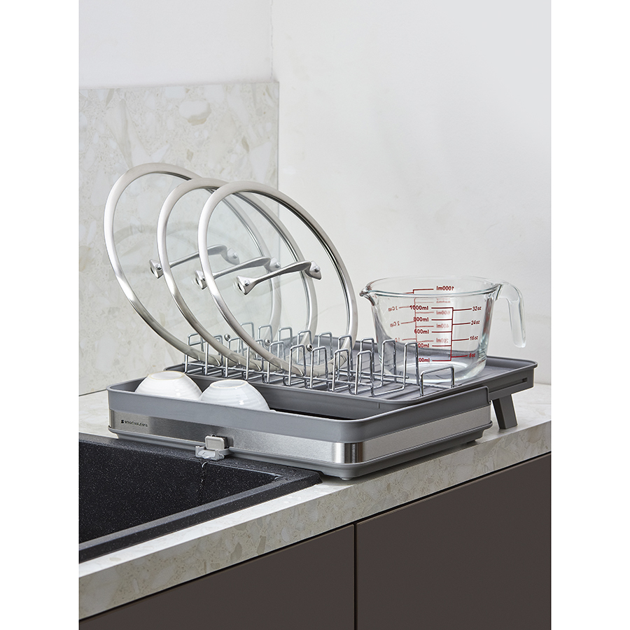 Сушилка Atle – компактная, но в то же время вместительная модель с раздвижной конструкцией, в которой предусмотрены отделения для посуды и кухонных принадлежностей. Удобное размещение и надежную фиксацию тарелок и других емкостей обеспечивают железные разделители. Поддон выполнен из практичного полипропилена, который легко моется. Стальные элементы на корпусе имеют специальное покрытие против отпечатков пальцев. Настольную сушилку можно размещать в любом месте и для ее установки не требуется делать отверстия в стене. Для хорошей устойчивости в раздвижном состоянии предусмотрены специальные ножки, расположенные в нижней части сушилки, которые выдвигаются одним движением руки.